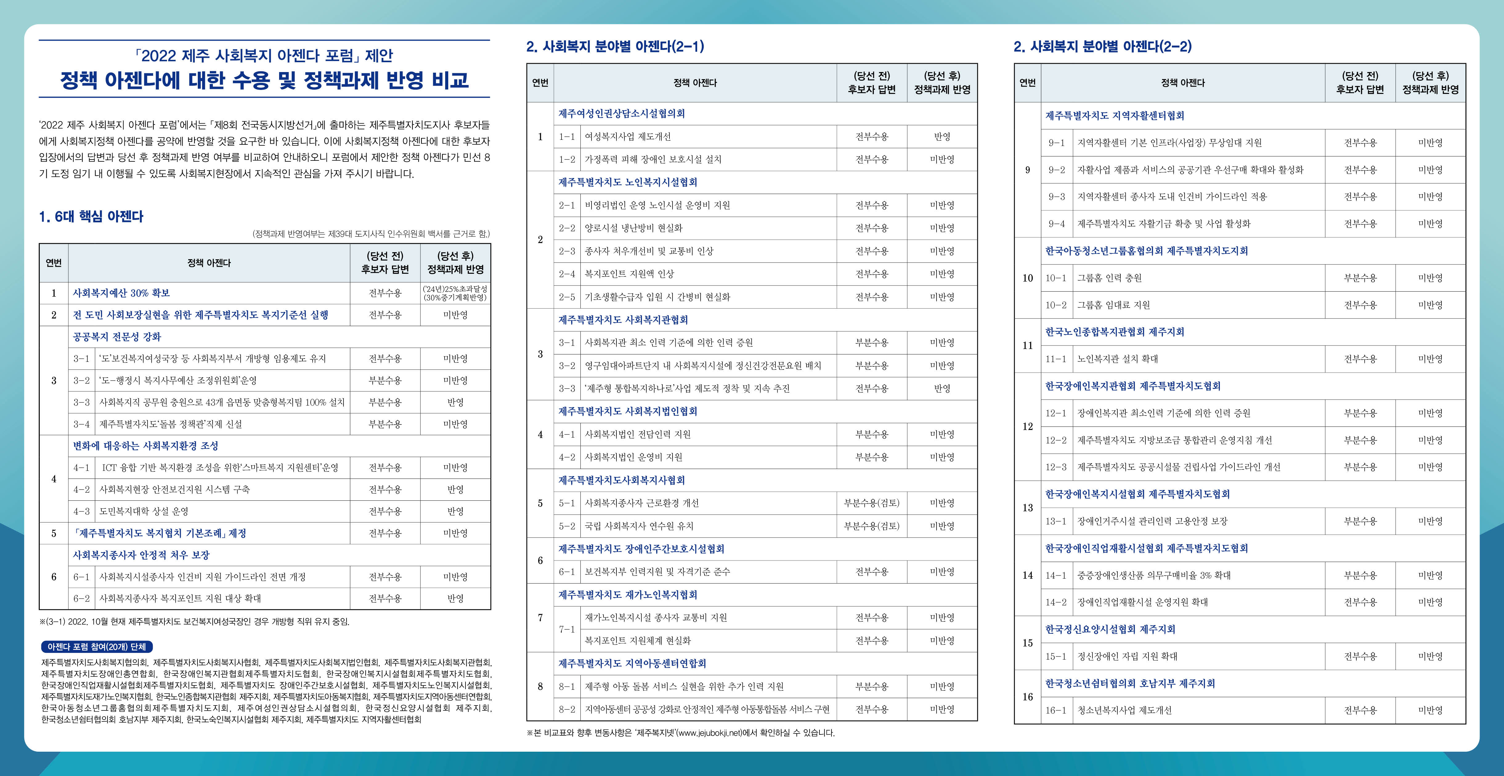 ‘2022 제주 사회복지 아젠다 포럼’에서는 「제8회 전국동시지방선거」에 출마하는 제주특별자치도지사 후보자들에게 사회복지정책 아젠다를 공약에 반영할 것을 요구한 바 있습니다.