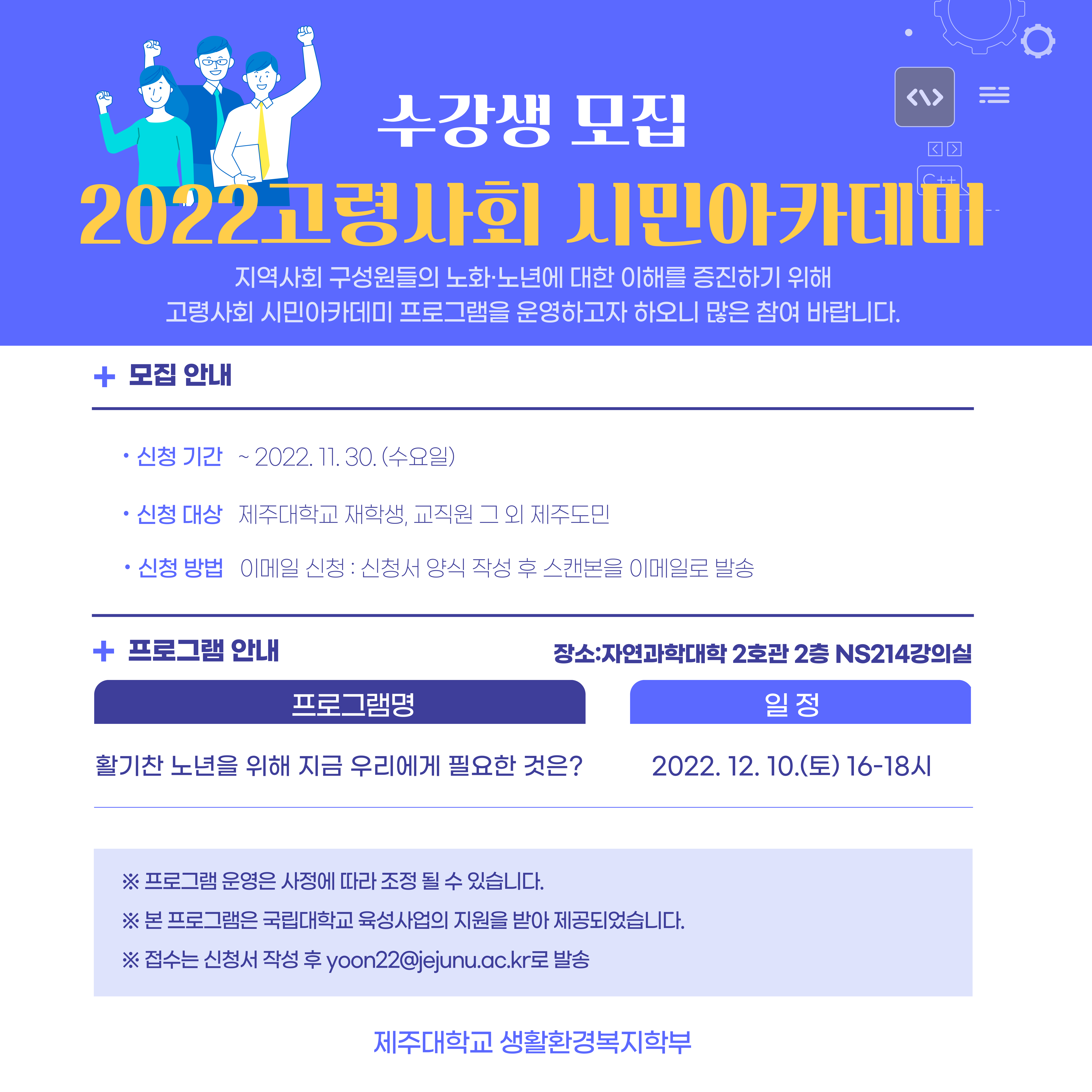 제주대학교 생활환경복지학부에서 2022고령사회 시민아카데미를 진행하오니 도민 여러분의 많은 참여바랍니다.