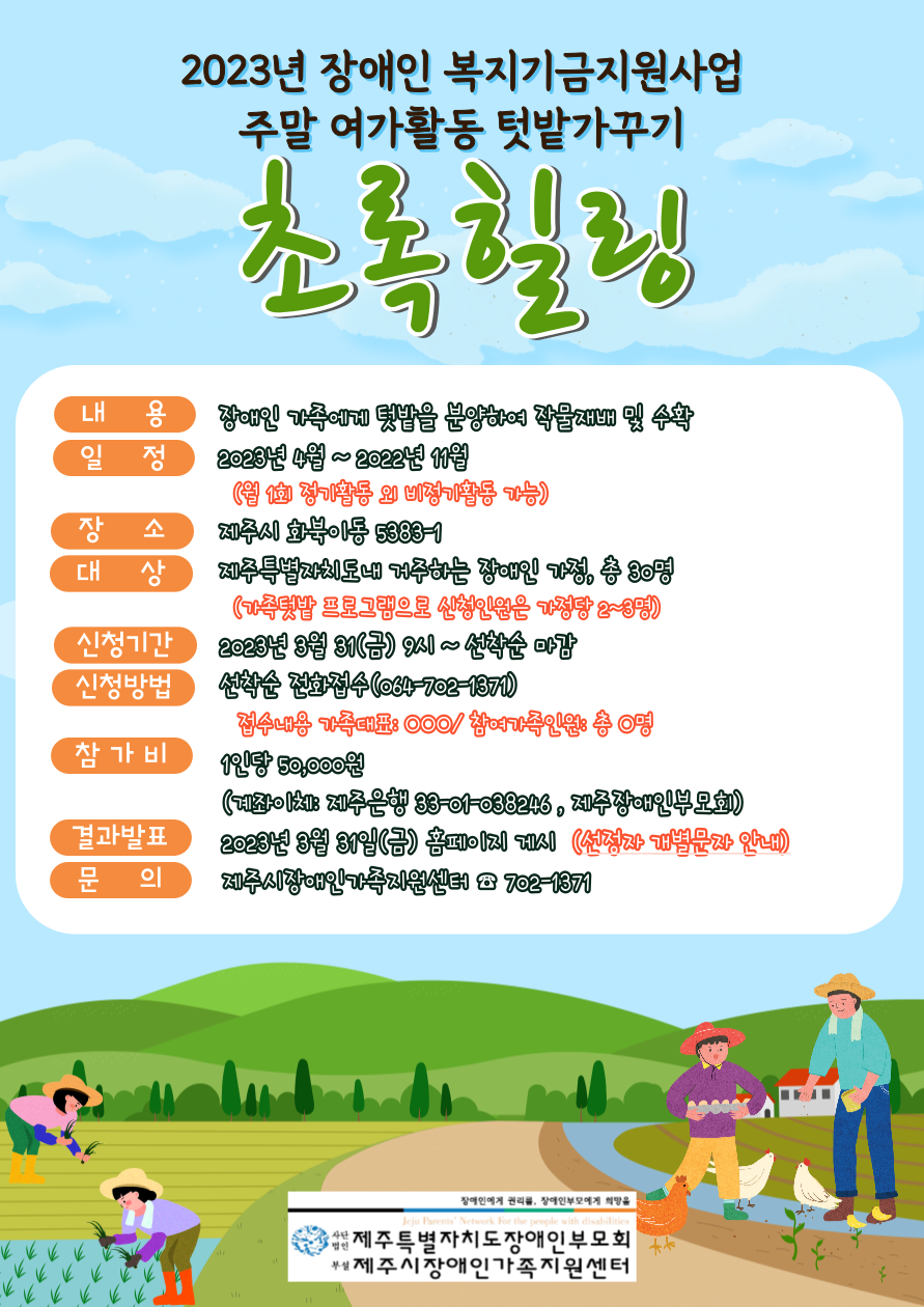 제주시장애인가족지원센터 2023년 장애인복지기금 주말여가활동 텃밭가꾸기 '초록힐링' 참가자 모집