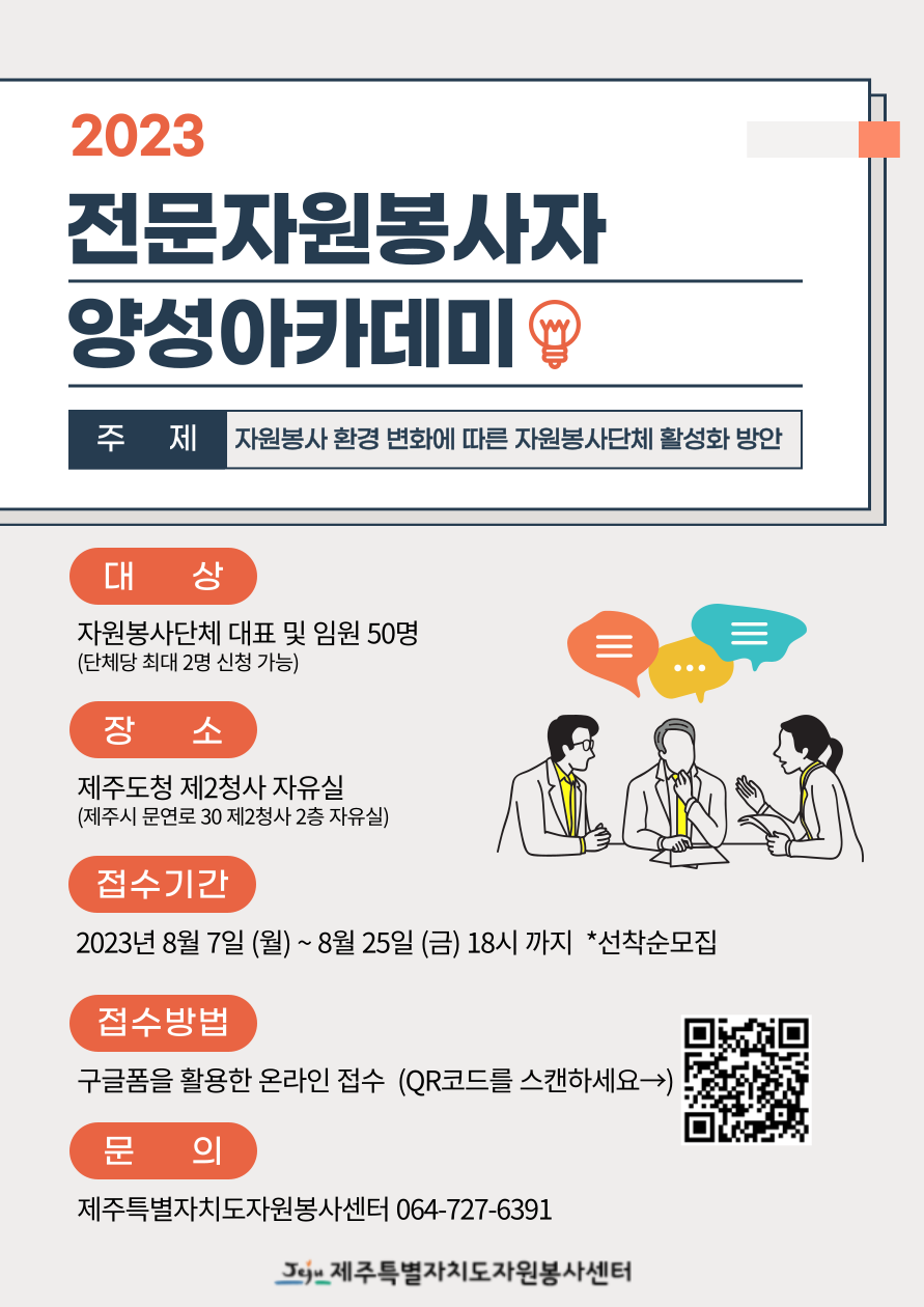 제주특별자치도자원봉사센터에서는 자원봉사 환경 변화에 따른 자원봉사단체 활성화를 위한 방안을 모색하고자 「2023 전문자원봉사자 양성아카데미(리더과정)」를 실시하오니, 많은 참여 부탁드립니다.