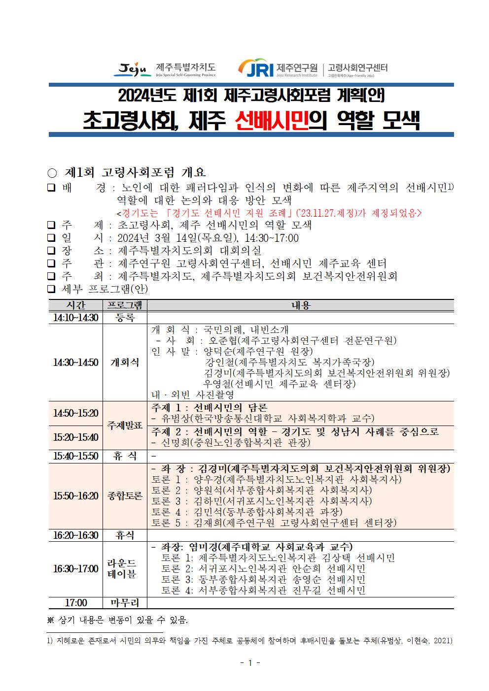  주 관 : 제주연구원 고령사회연구센터, 선배시민 제주교육 센터