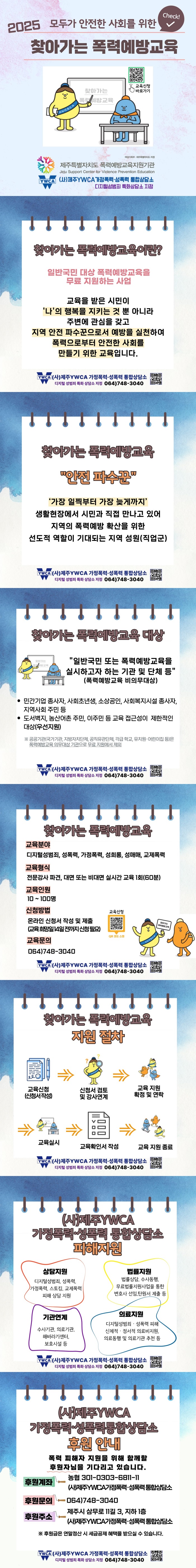 - 2025년 여성가족부와 제주특별자치도 수탁 폭력예방교육 지역지원기관으로 선정됨에 따라 『찾아가는 폭력예방교육 』을 시행합니다.