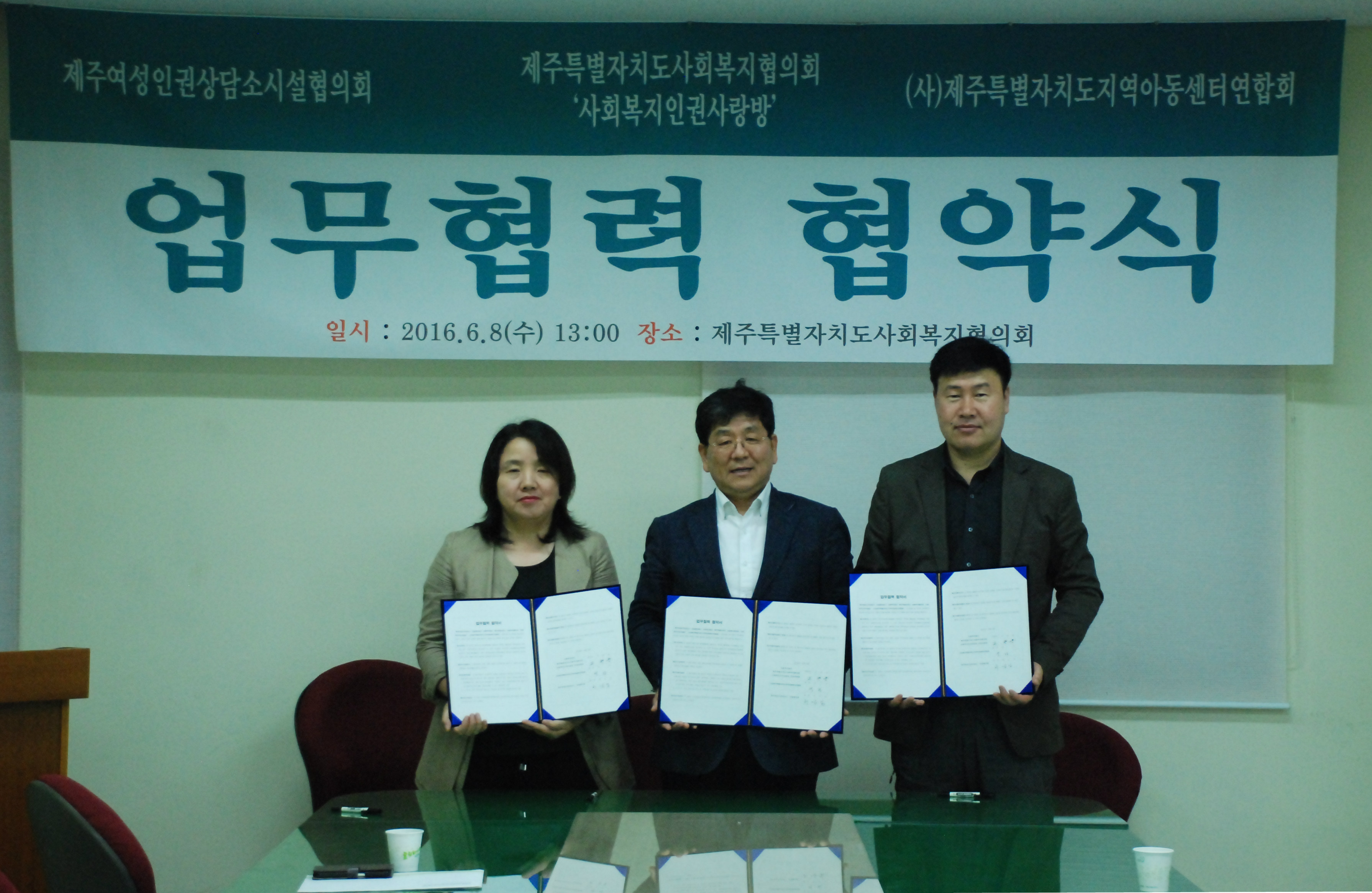 사회복지인권사랑방(운영위원장 : 고관용)은 2016. 6. 8(수) 13:00 제주여성인권상담소시설협의회(회장: 허순임), 사)제주특별자치도지역아동센터연합회(회장 : 석 건)과 취약계층과 사회복지시설종사자 지원을 위한 업무협약을 제주특별자치도사회복지협의회 소회의실에서 체결했습니다.