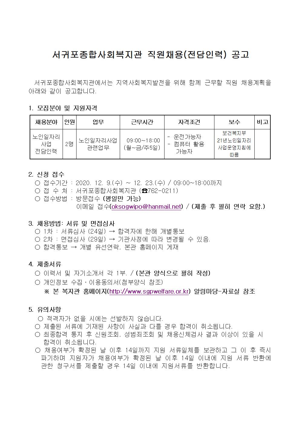 서귀포종합사회복지관 직원채용(전담인력)공고