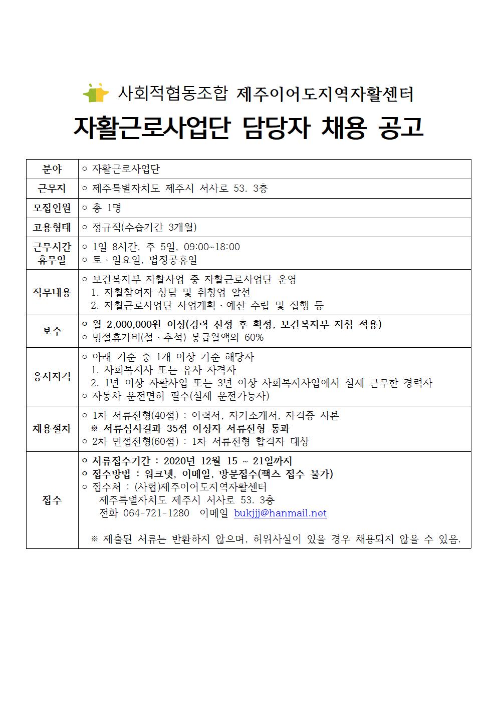 사회적협동조합 제주이어도지역자활센터 자활근로사업단 담당자 채용 공고