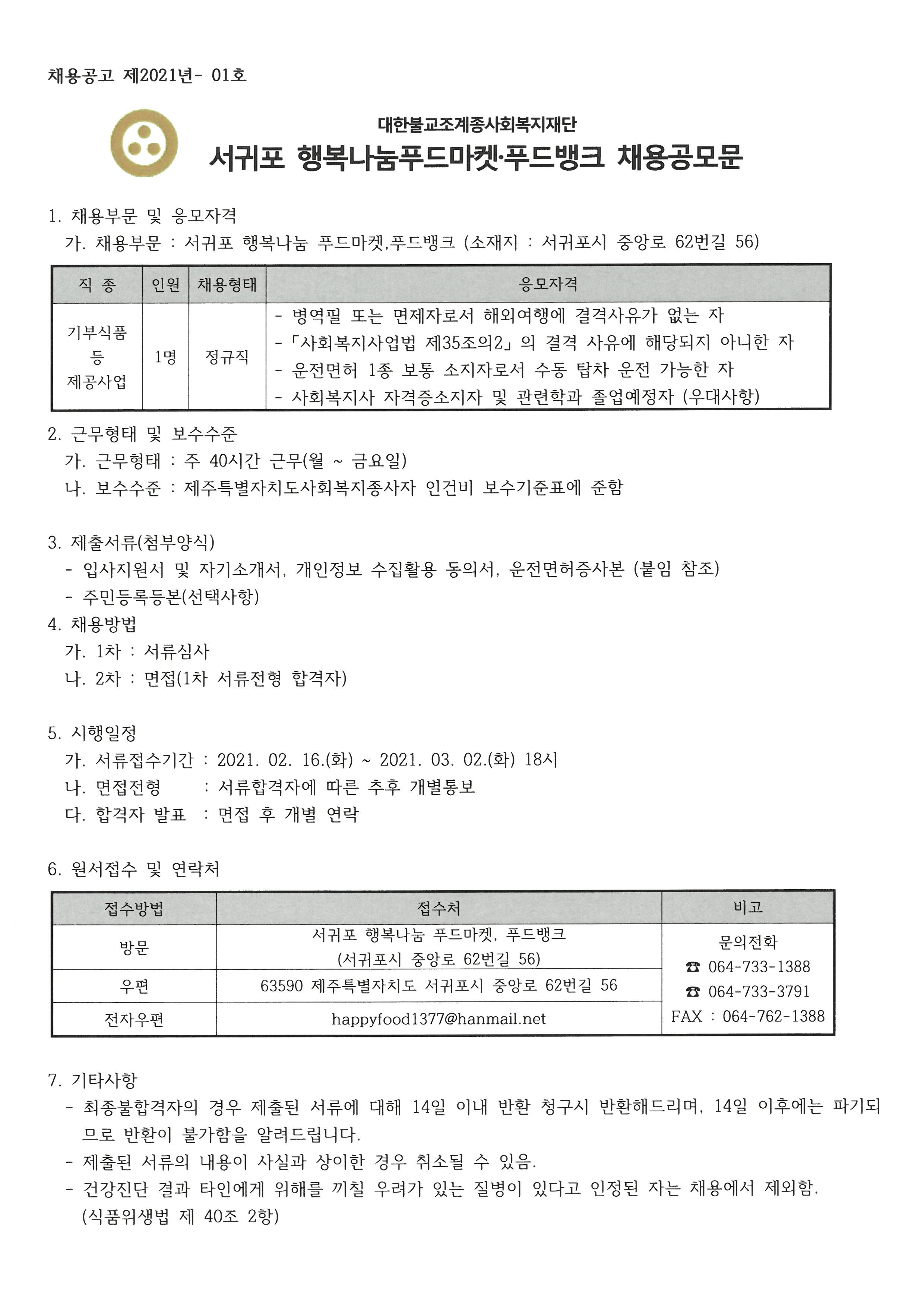 서귀포행복나눔푸드마켓,푸드뱅크 직원 채용 공모
