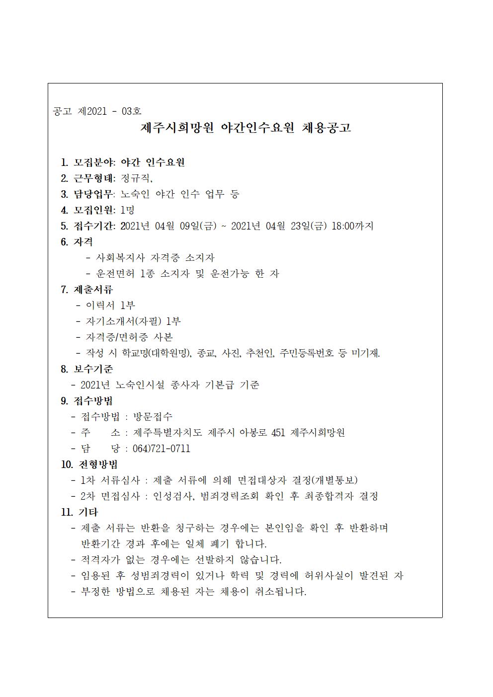 제주시희망원 야간인수요원 채용공고