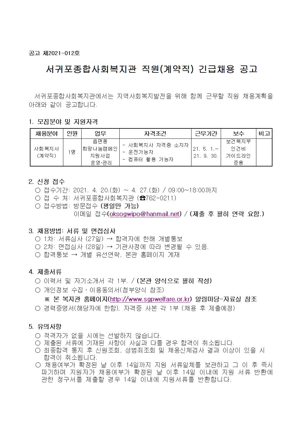 (긴급) 서귀포종합사회복지관 직원(계약직) 채용 공고