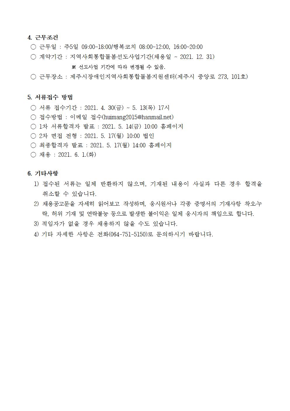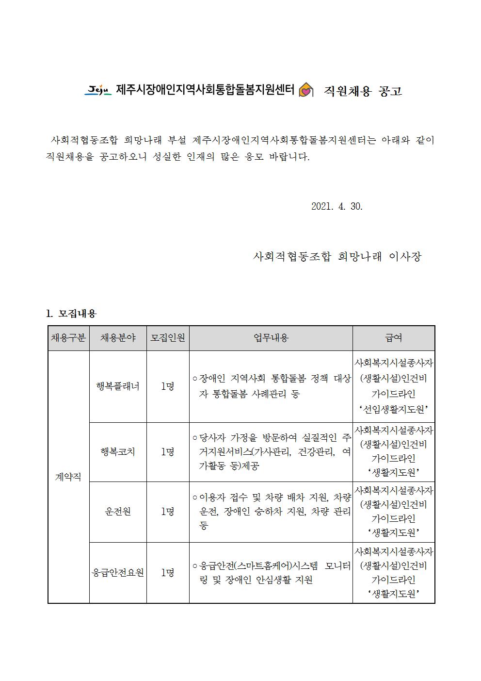 [희망나래]제주시장애인지역사회통합돌봄지원센터 계약직 직원 채용