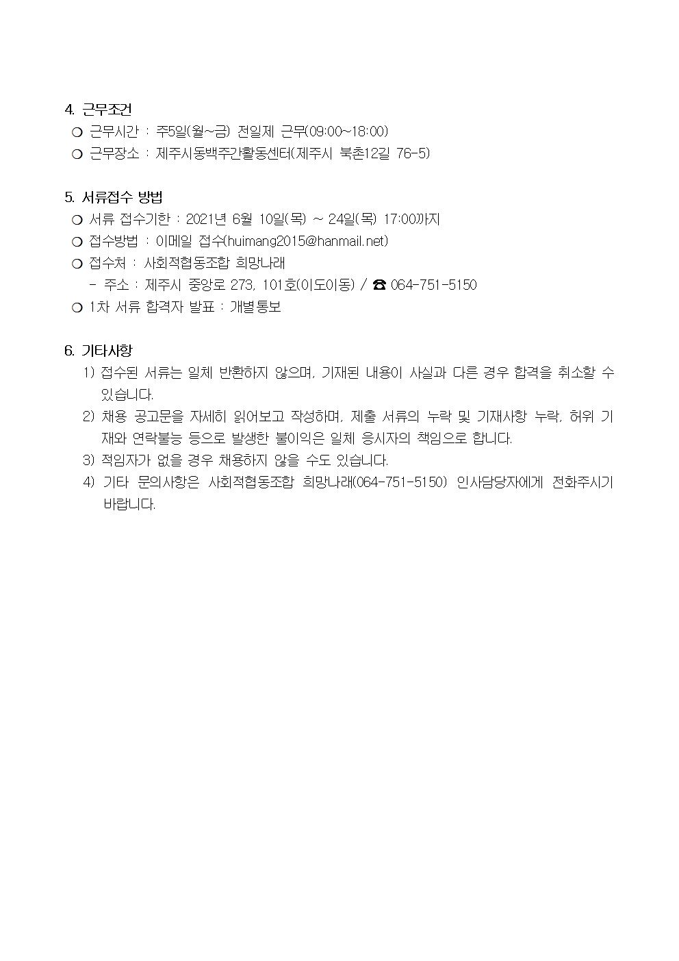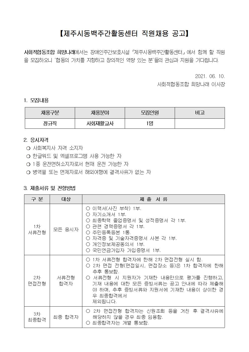 [제주시동백주간활동센터]사회재활교사 채용 공고