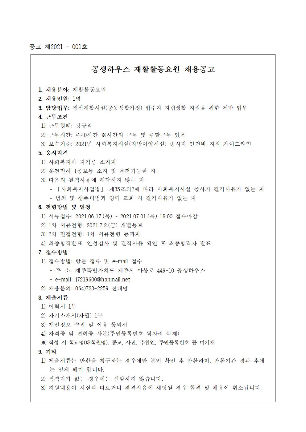 공생하우스 재활활동요원 채용공고