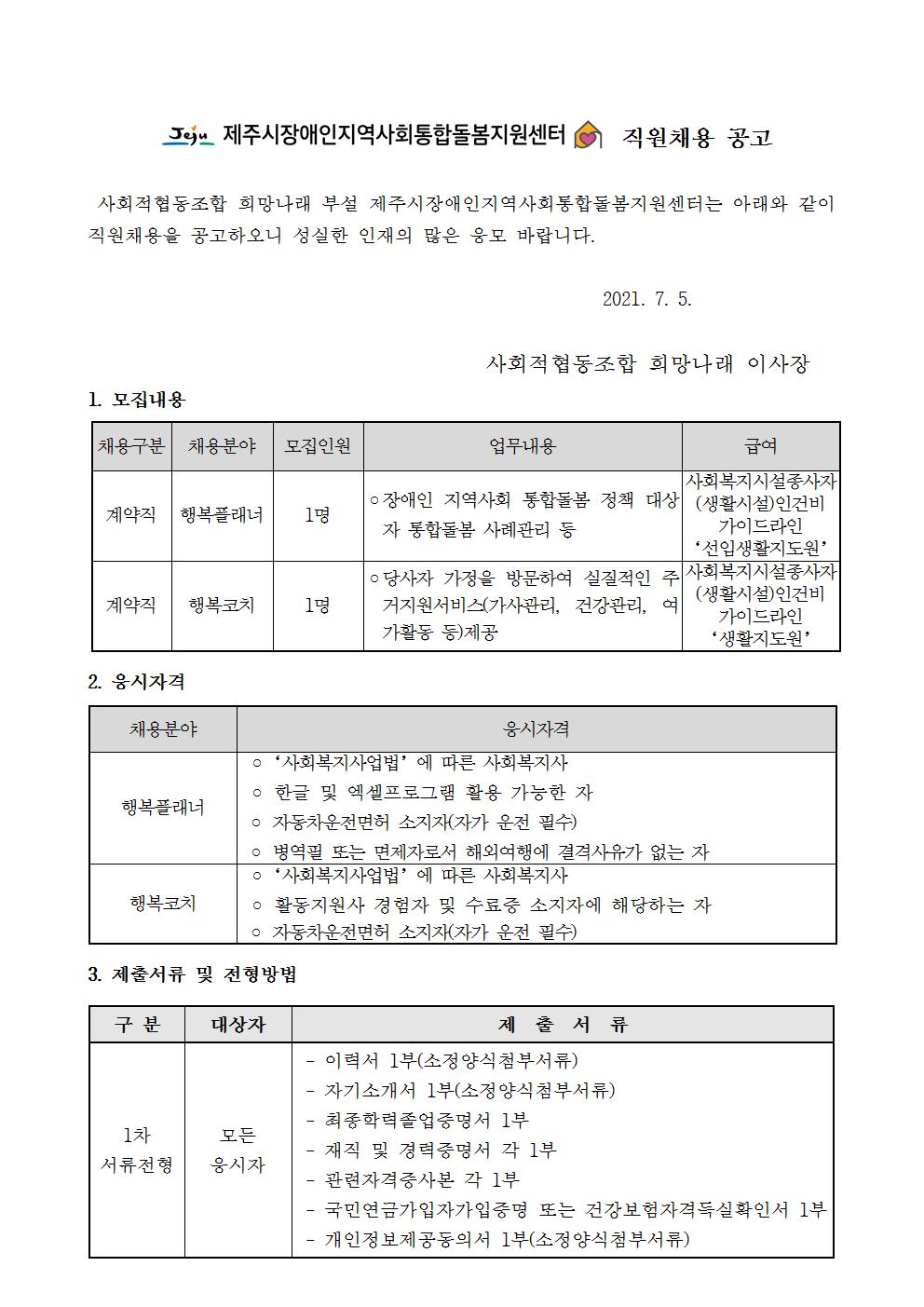 [제주시장애인지역사회통합돌봄지원센터] 행복플래너, 행복코치 채용 공고