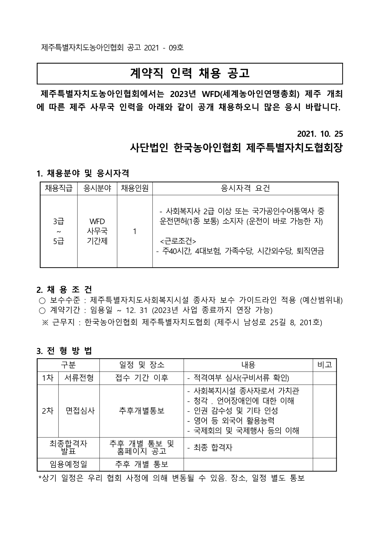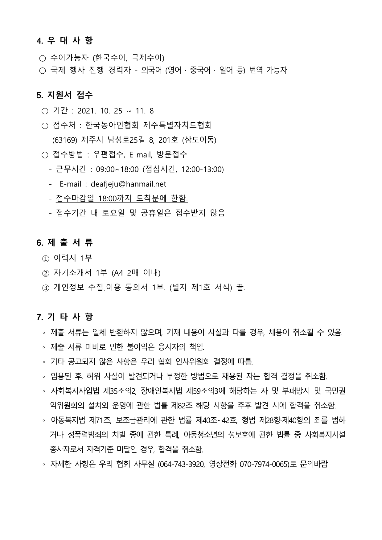 제주특별자치도농아인협회 계약직 인력 채용 재공고
