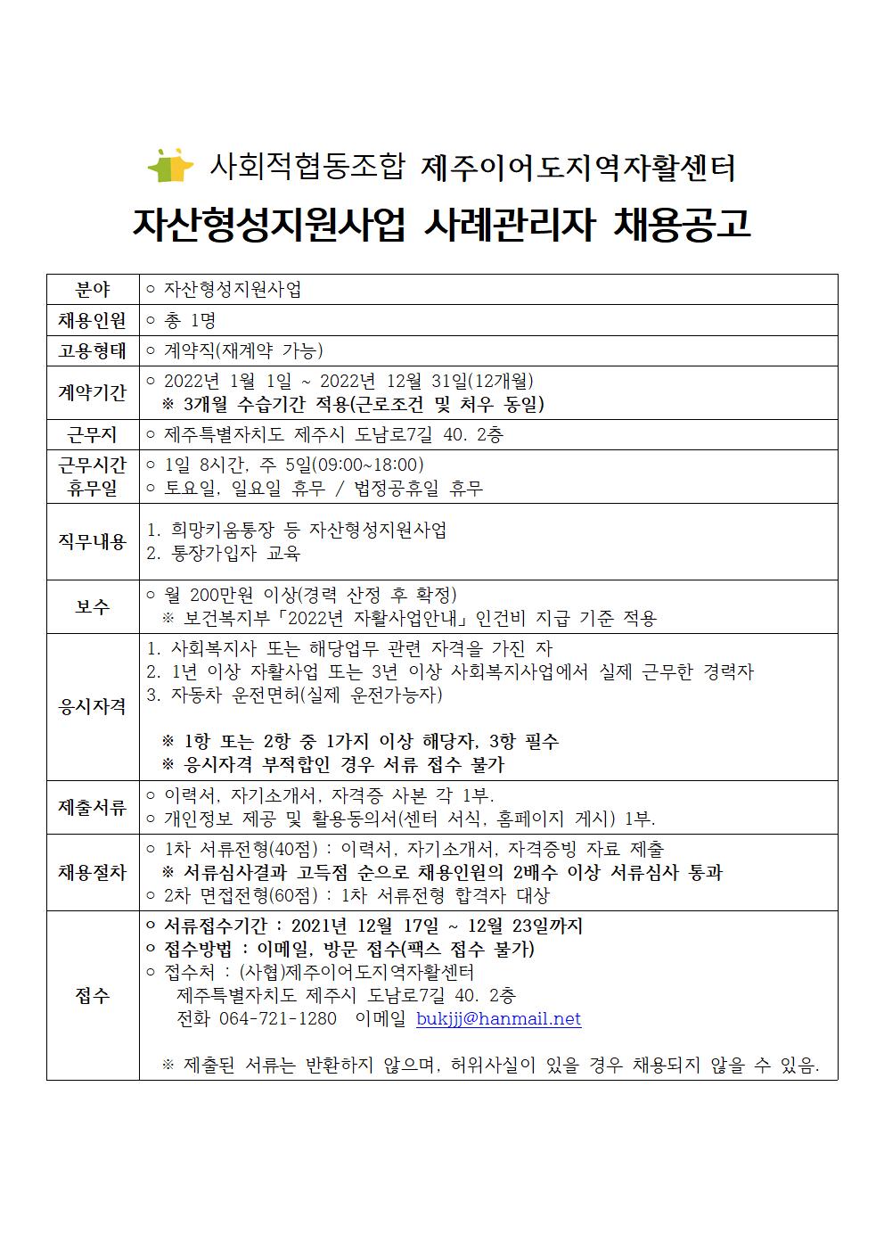 사회적협동조합 제주이어도지역자활센터 자산형성지원사업 사례관리자 채용공고
