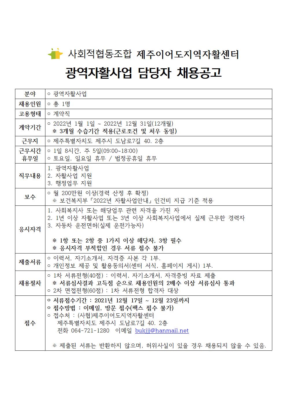 사회적협동조합 제주이어도지역자활센터 광역자활사업 담당자 채용공고