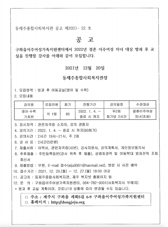 구좌읍이주여성가족지원센터 방과 후 교실 영어, 수학 강사 모집공고