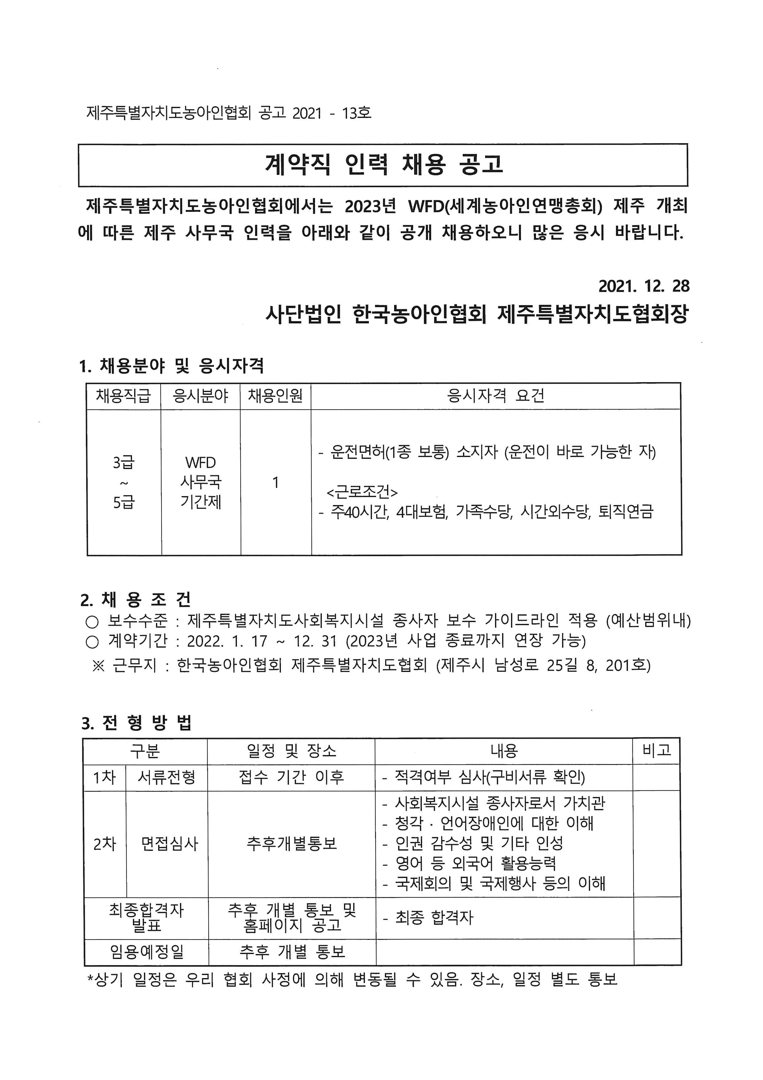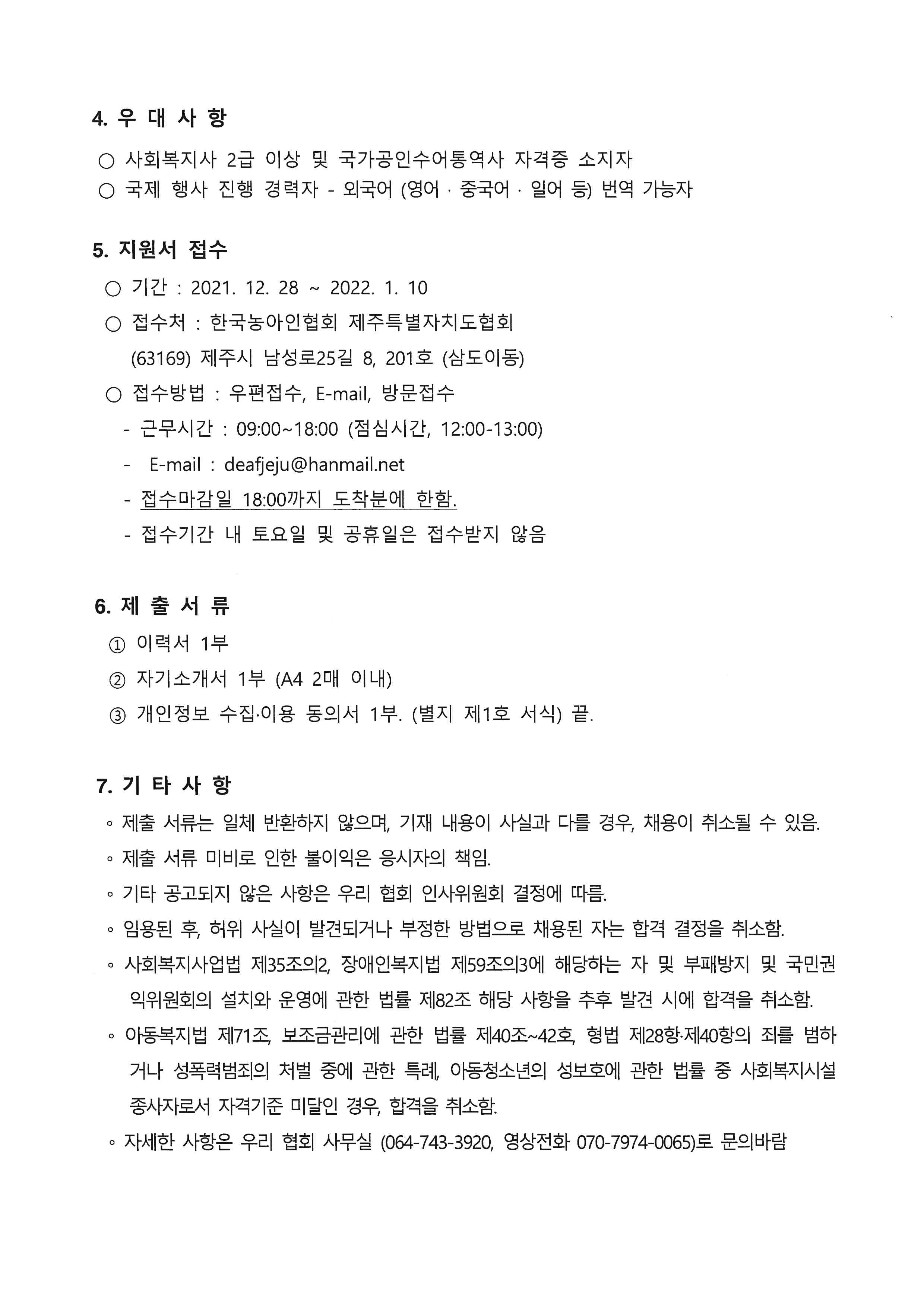 사)한국농아인협회제주특별자치도협회 인력 채용 공고