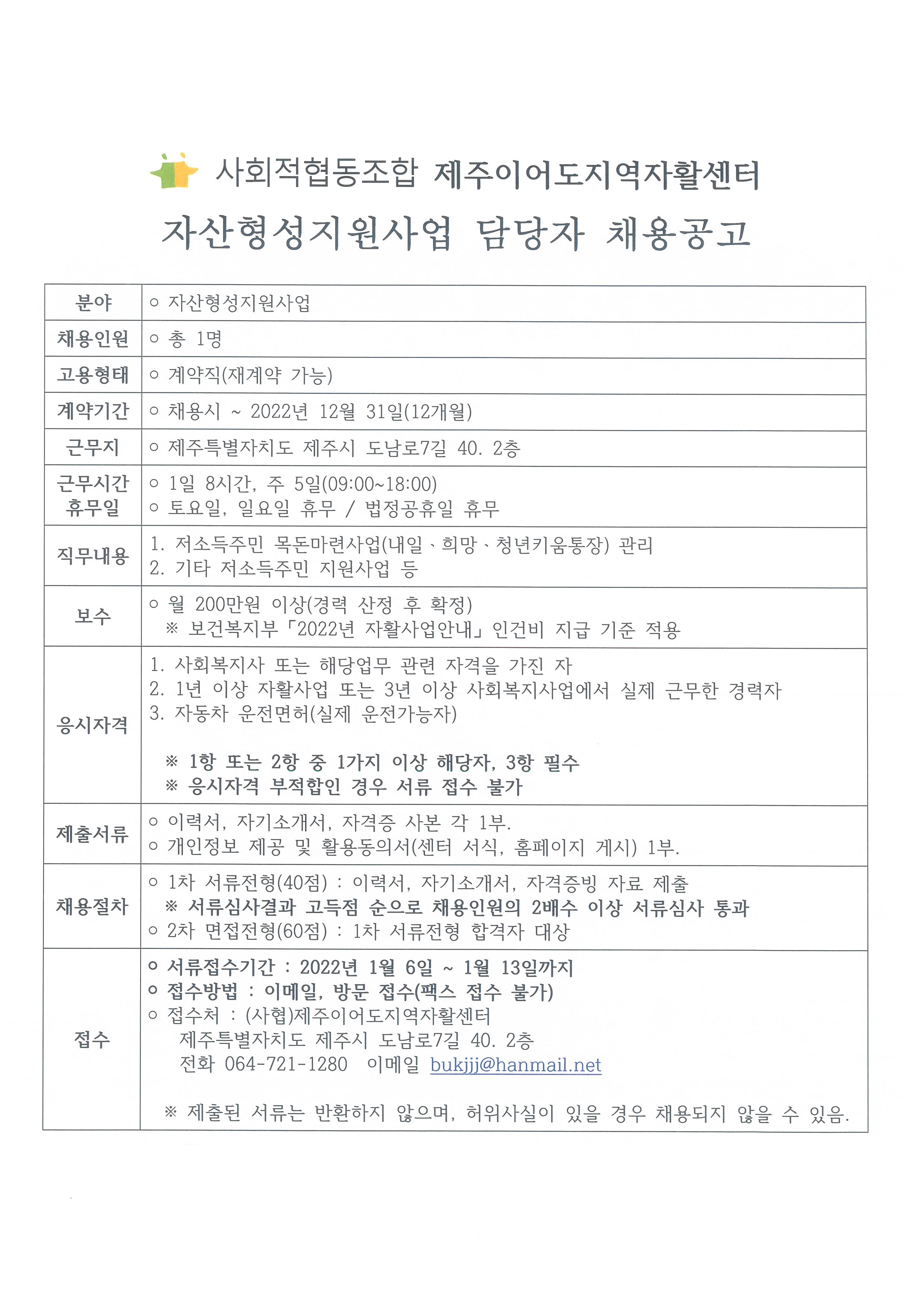 사회적협동조합 제주이어도지역자활센터 자산형성지원사업 담당자 채용공고