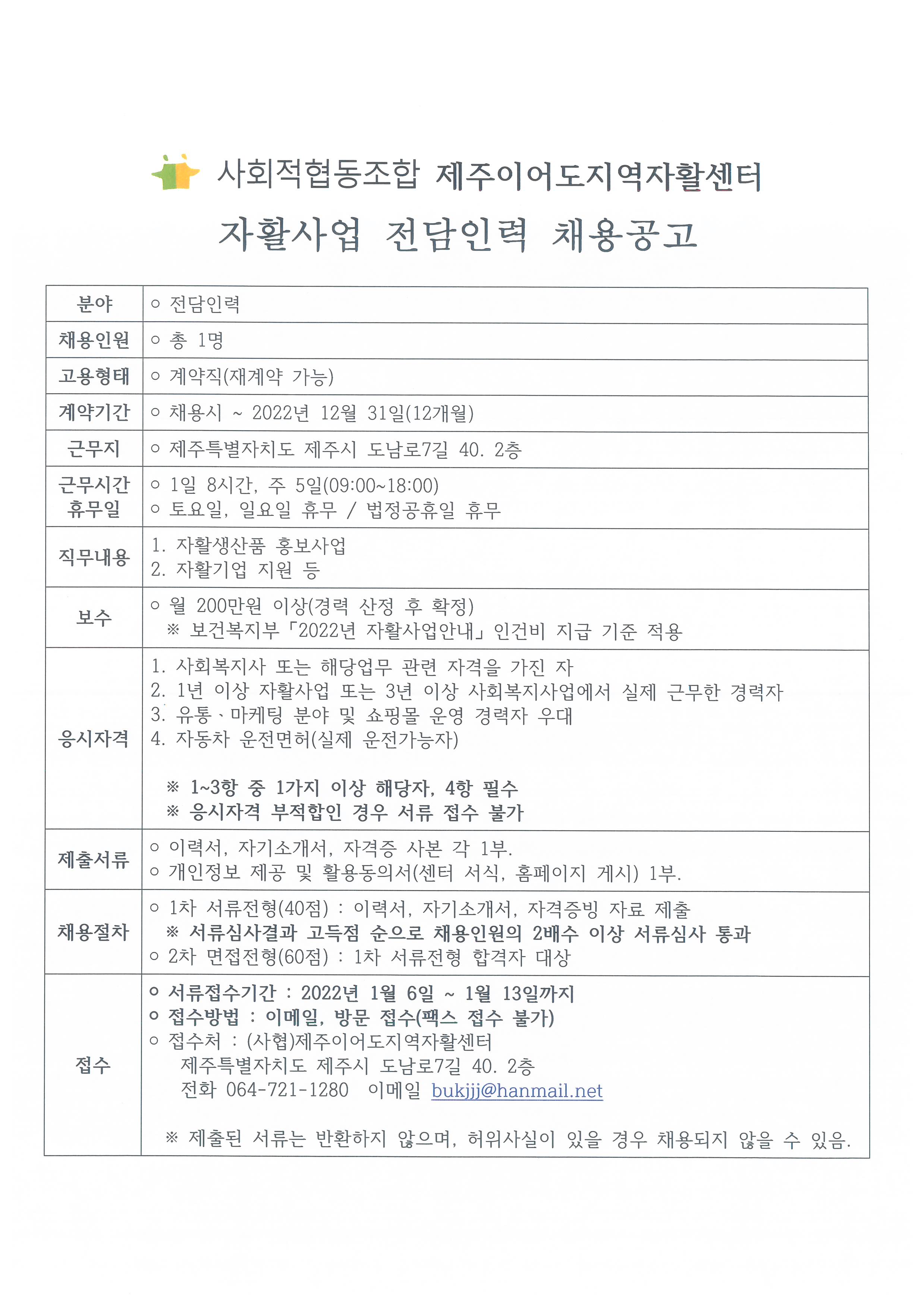 사회적협동조합 제주이어도지역자활센터 자활사업 전담인력 채용공고