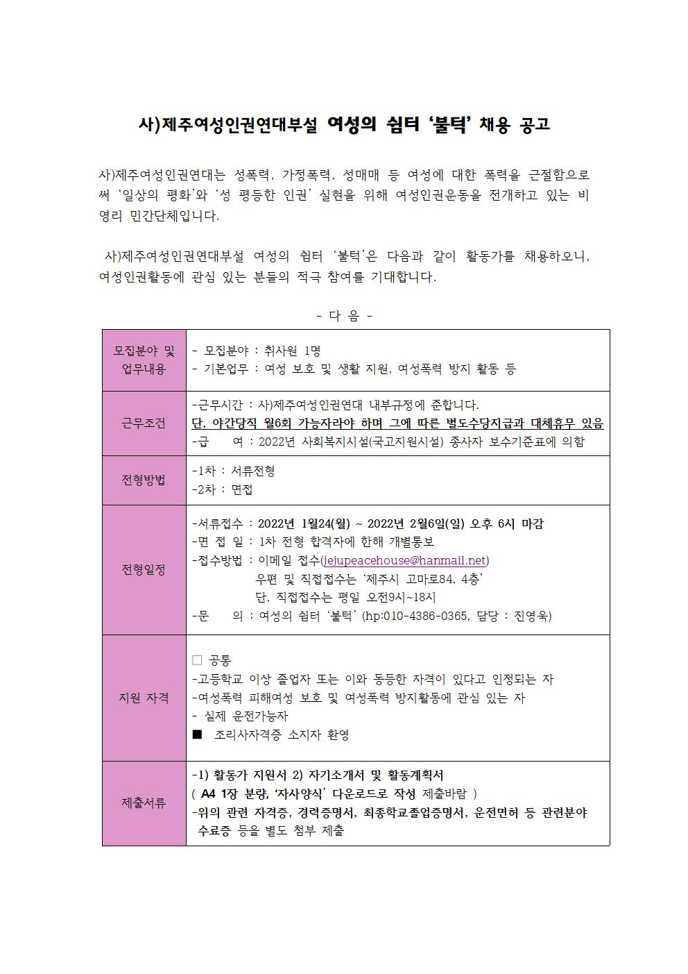 사)제주여성인권연대부설 여성의 쉼터 ‘불턱’ 채용 공고