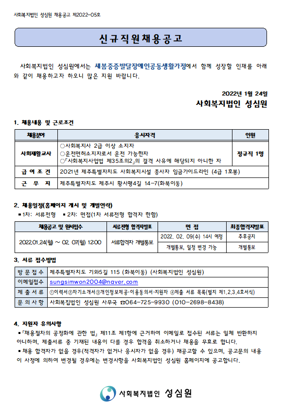 새봄 중증발달장애인공동생활가정 (사회재활교사1명)