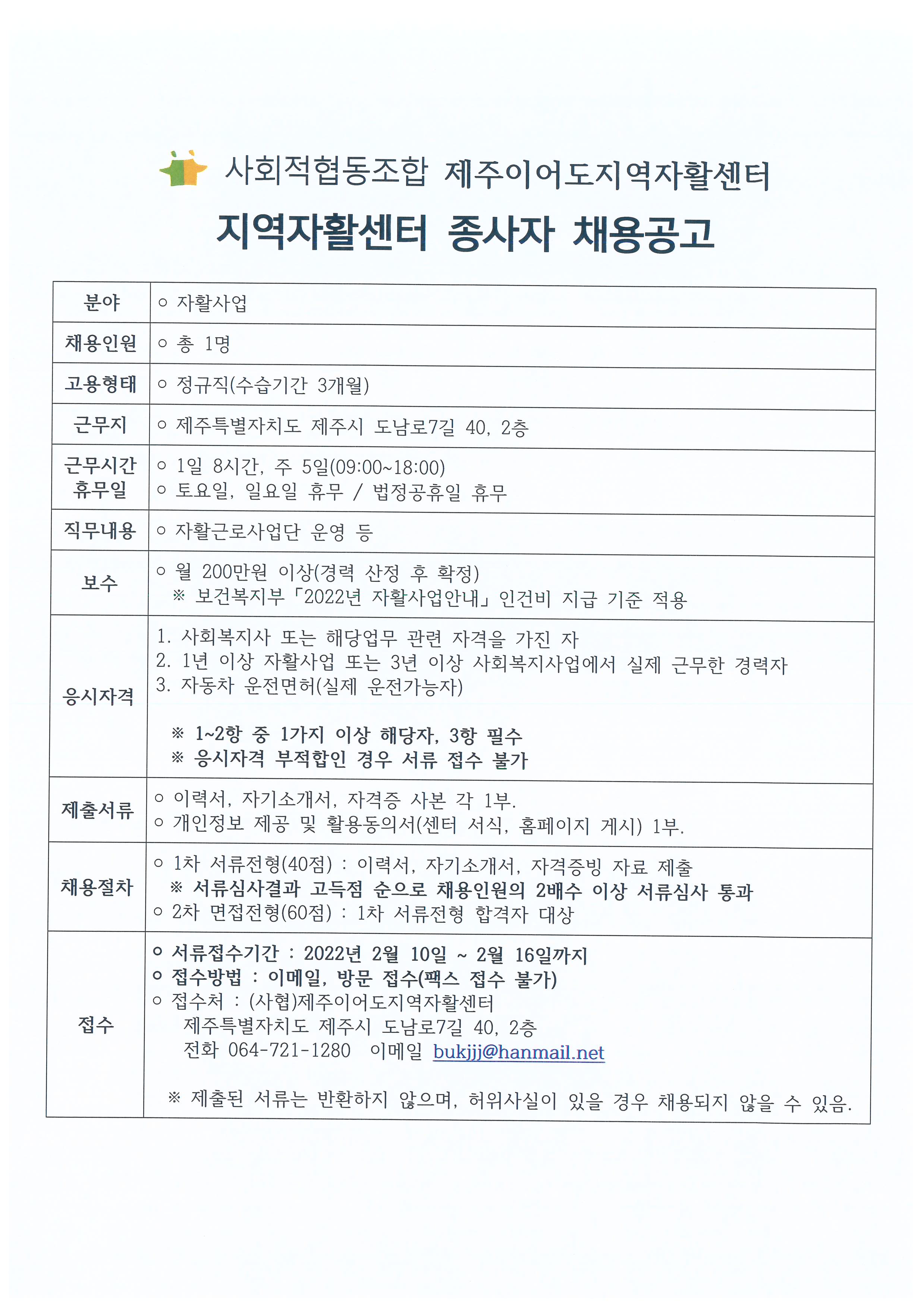 사회적협동조합 제주이어도지역자활센터 종사자 채용공고