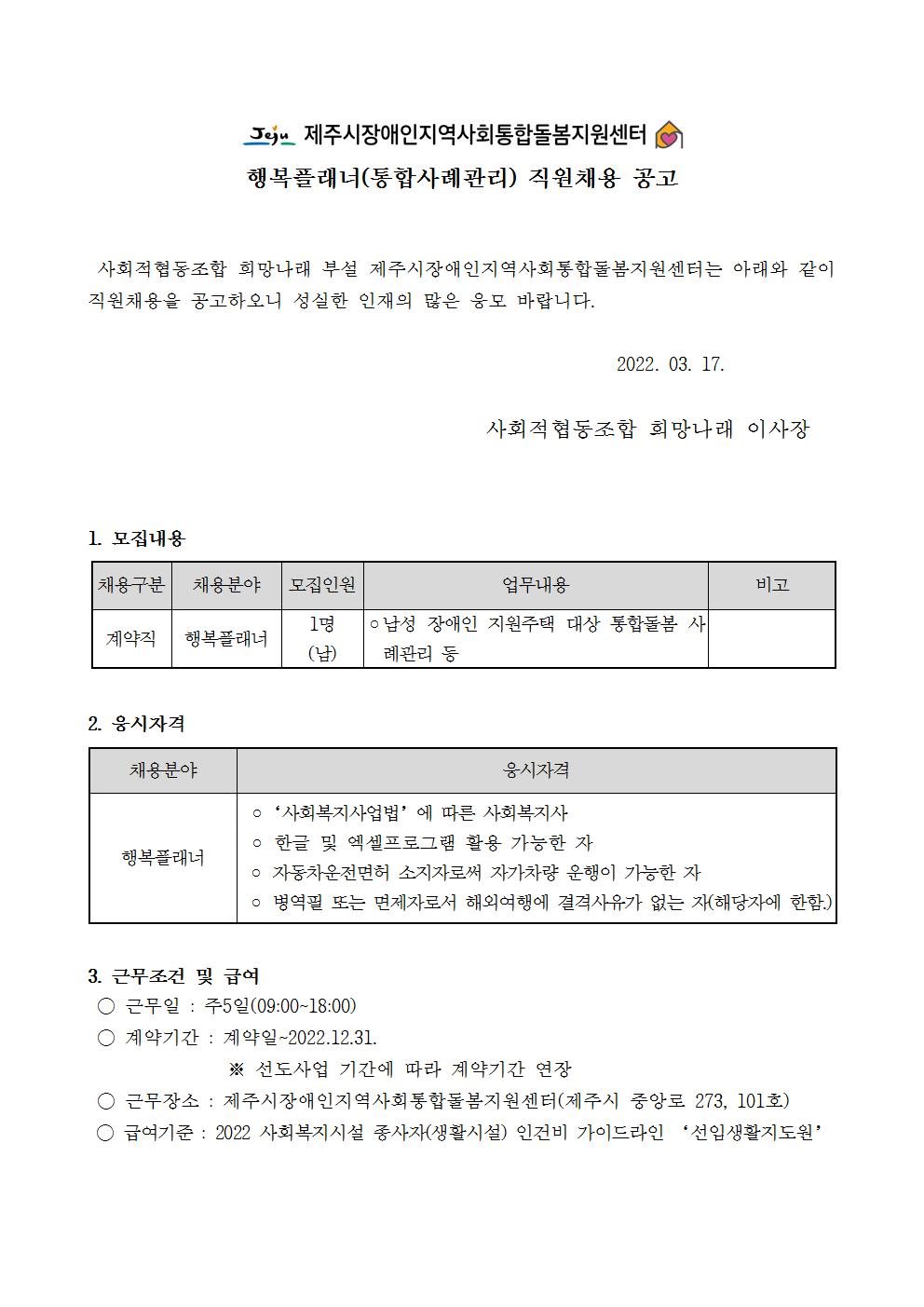 [제주시장애인지역사회통합돌봄지원센터]행복플래너 추가 채용 공고