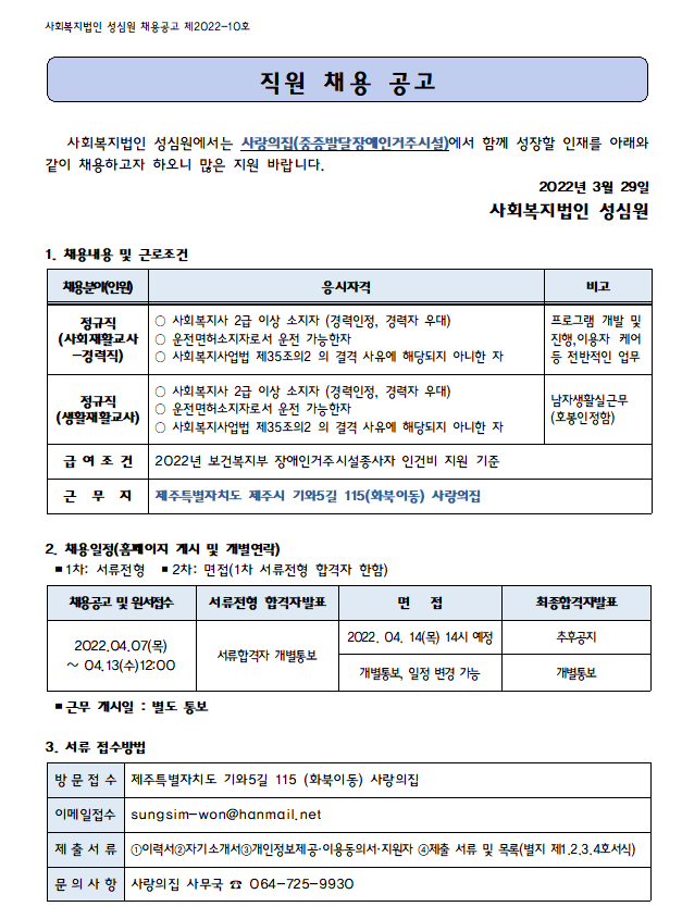 ■생활재활교사(정규직 2명) 남자생활실근무(경력인정)