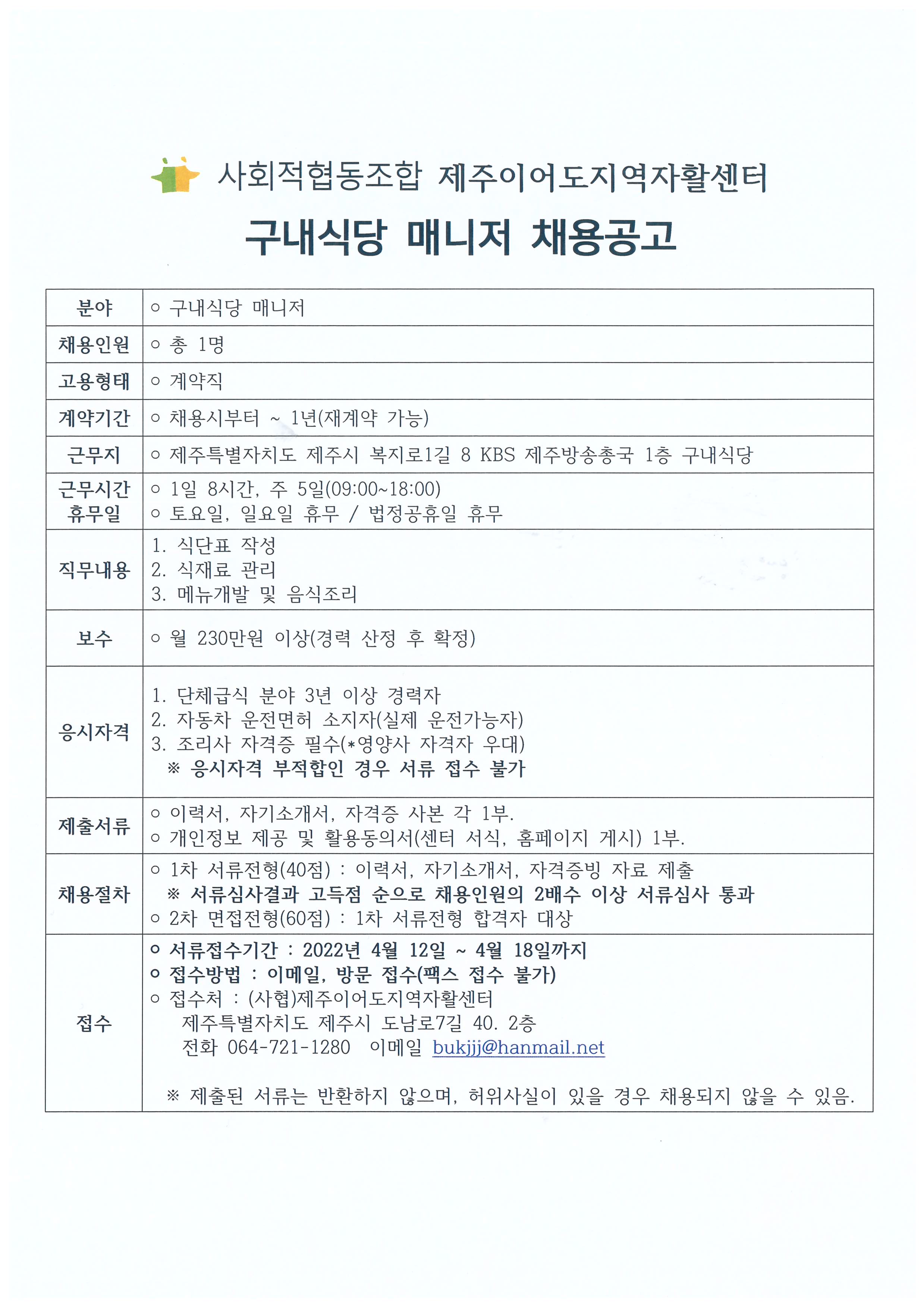 사회적협동조합 제주이어도지역자활센터 구내식당 매니저 채용공고