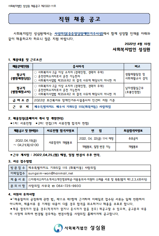■생활재활교사(정규직 1명) 남자생활실근무(경력인정)