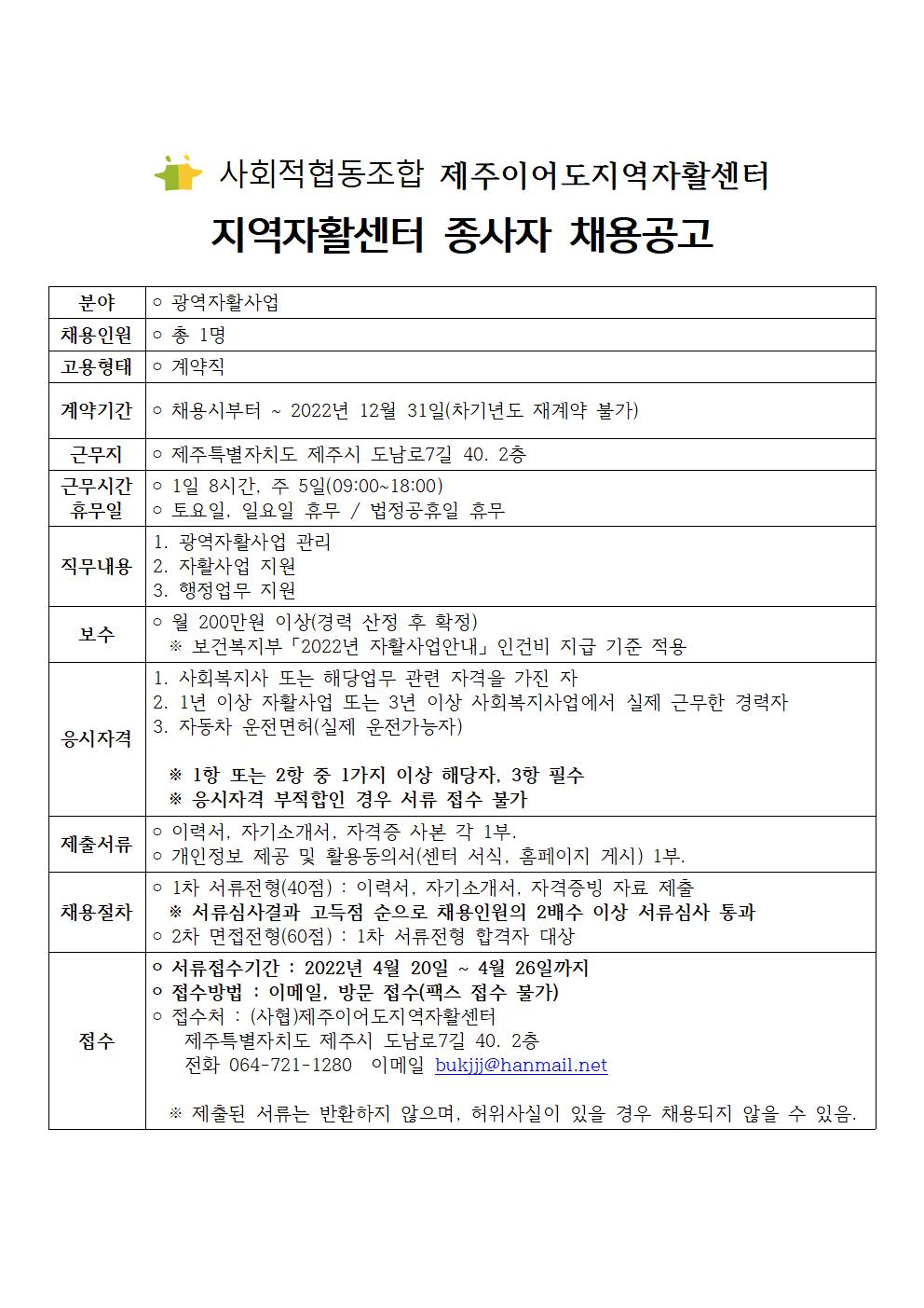 사회적협동조합 제주이어도지역자활센터 광역자활사업 담당자 채용공고
