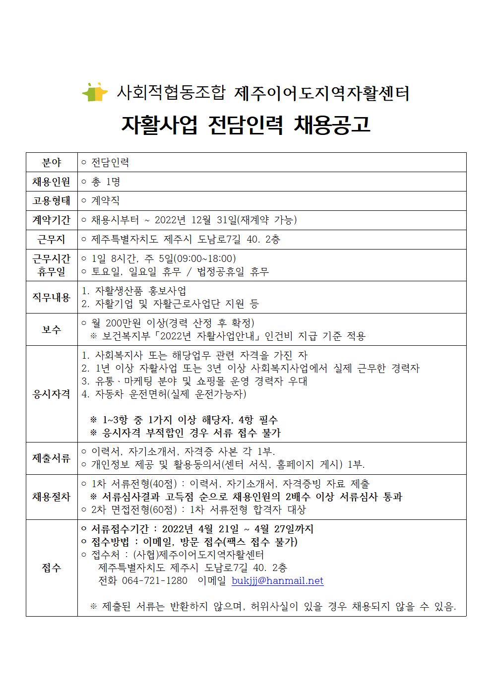 사회적협동조합 제주이어도지역자활센터 자활사업 전담인력 채용공고