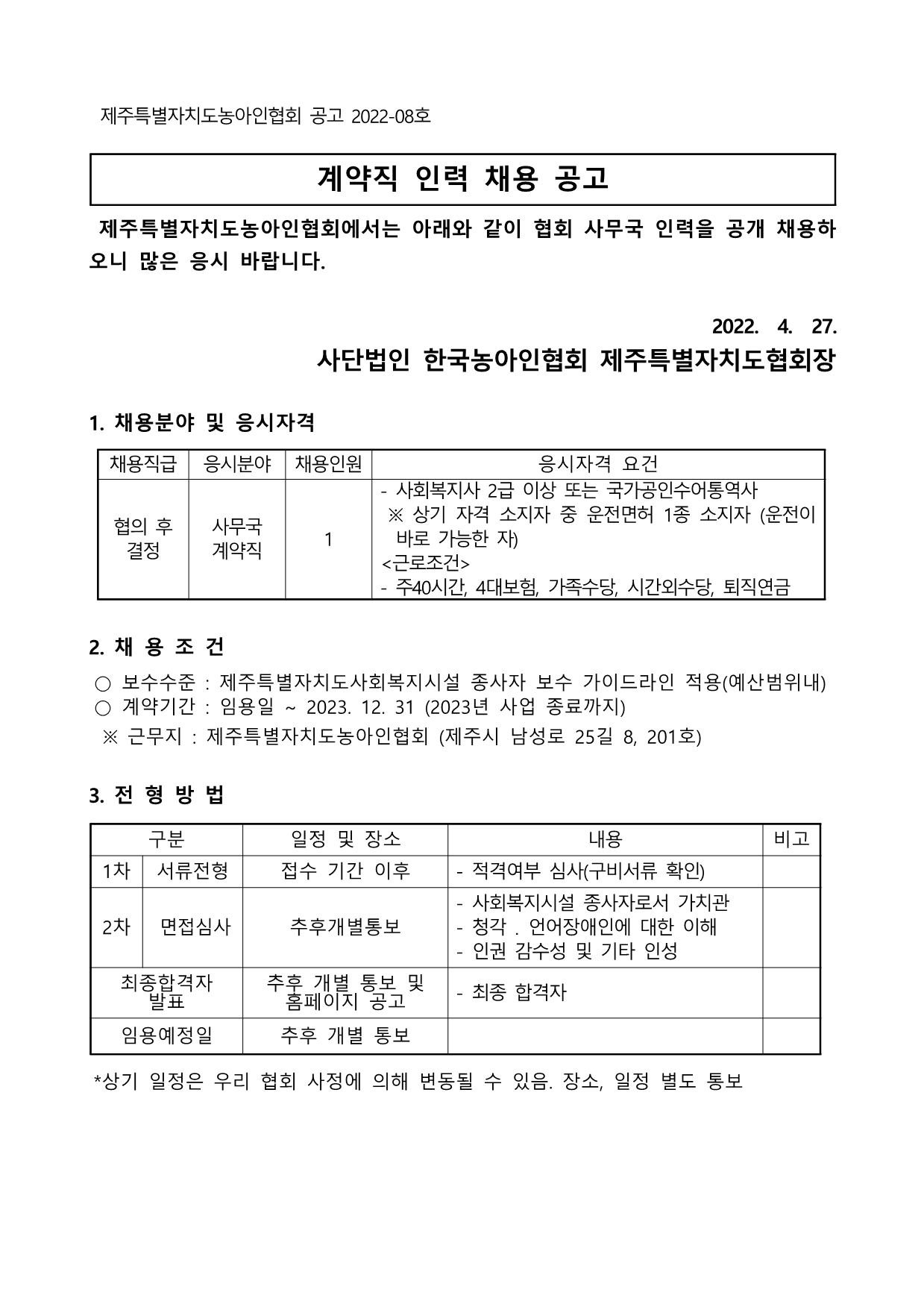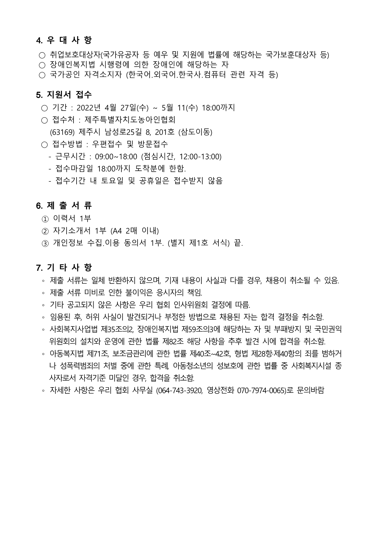 사)한국농아인협회제주특별자치도협회 인력 채용 공고