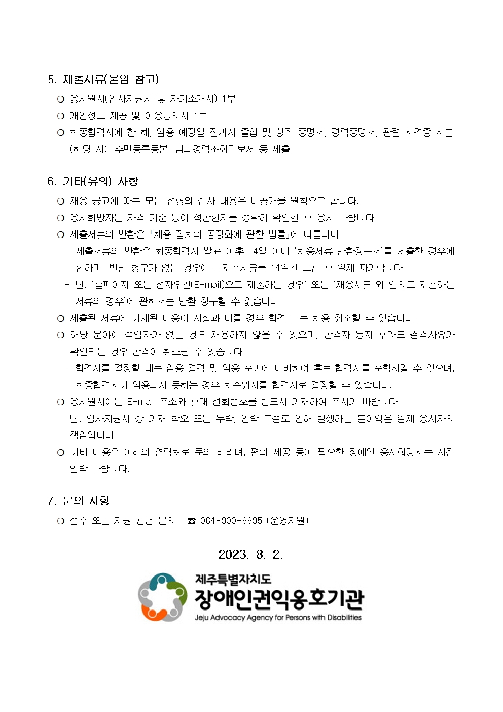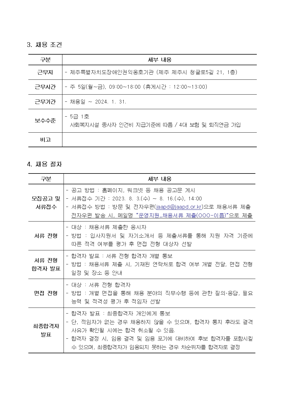 제주특별자치도장애인권익옹호기관 직원 채용 모집(운영지원, 기간제)