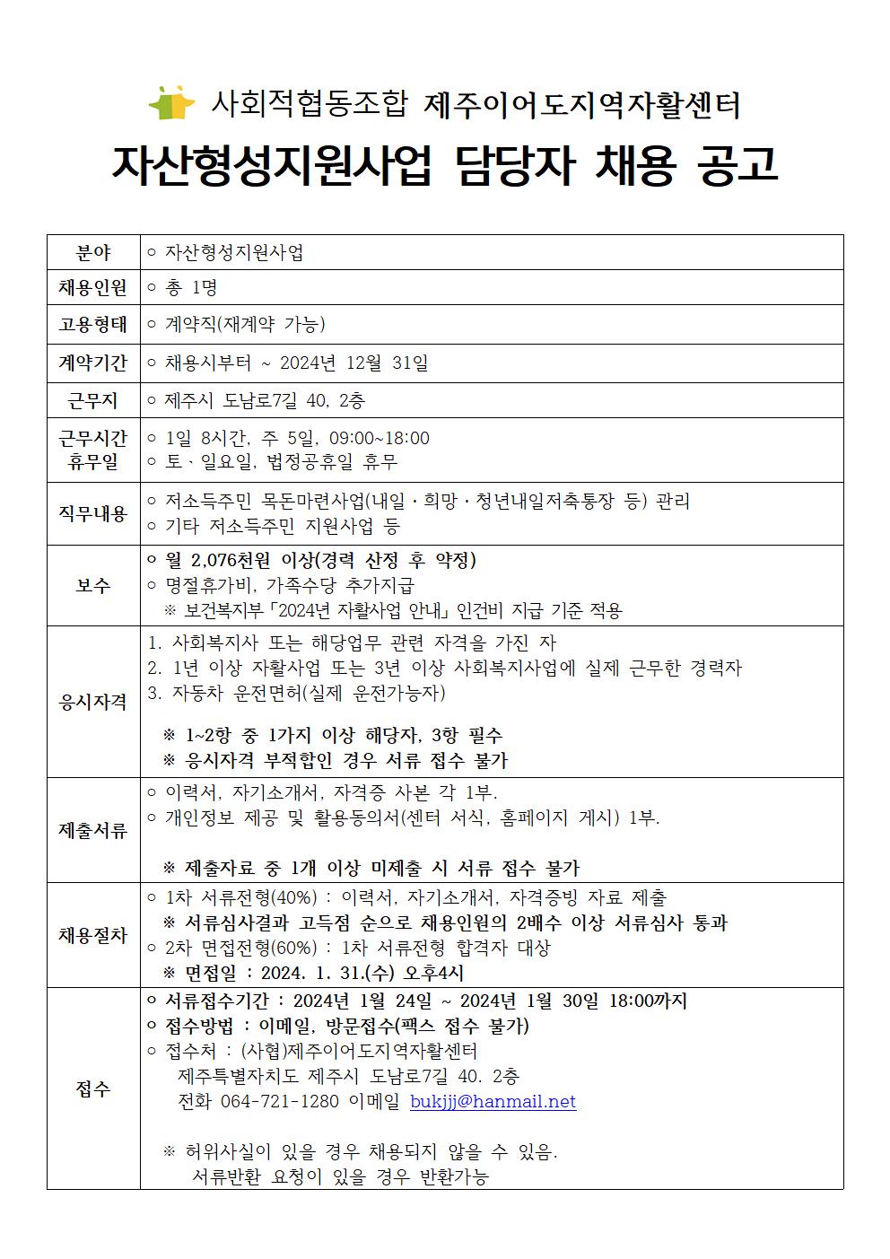 사회적협동조합 제주이어도지역자활센터 자산형성지원사업 담당자 채용 공고