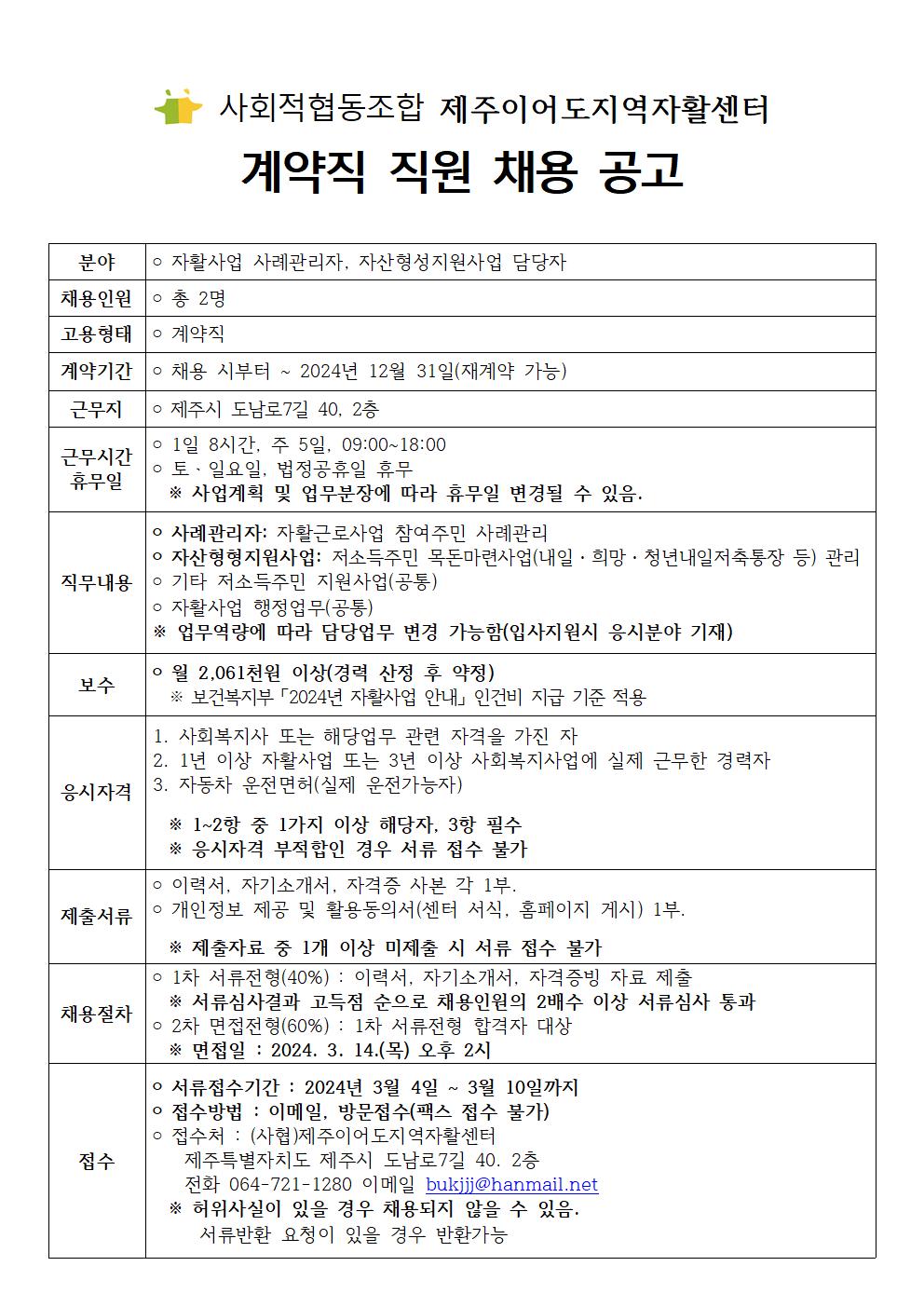 사회적협동조합 제주이어도지역자활센터 계약직 직원을 채용합니다.