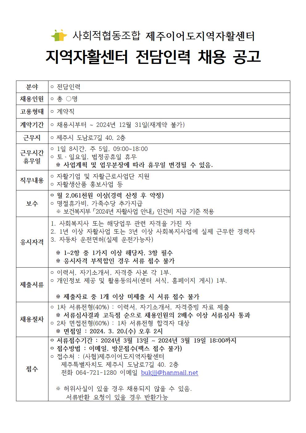 (사협)제주이어도지역자활센터 자활사업 전담인력 채용공고(계약직)