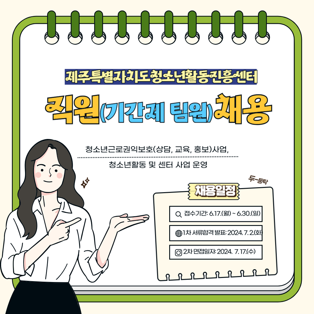 제주특별자치도청소년활동진흥센터 직원(기간제 팀원) 채용을 위하여 아래와 같이 공고하오니 역량 있는 인재들의 많은 지원 바랍니다.