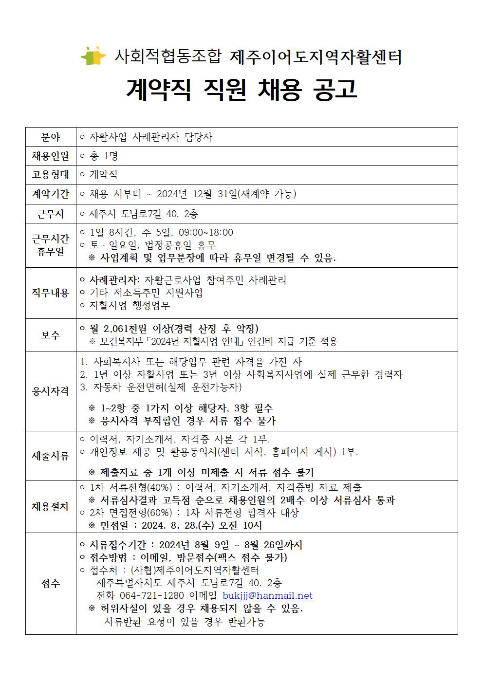 사회적협동조합 제주이어도지역자활센터 계약직(사례관리자) 채용합니다.
