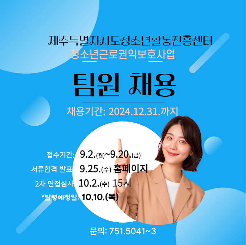 제주특별자치도청소년활동진흥센터 기간제 직원 채용 공고 - 청소년근로권익보호사업