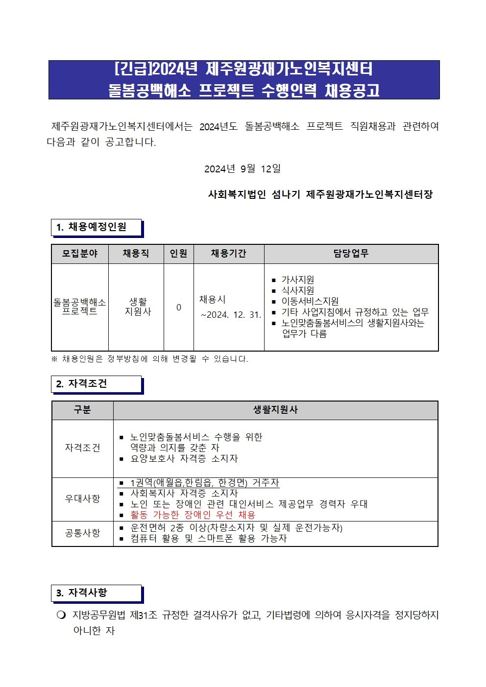 [긴급]2024년 제주원광재가노인복지센터 돌봄공백해소 프로젝트 수행인력 채용공고(생활지원사)