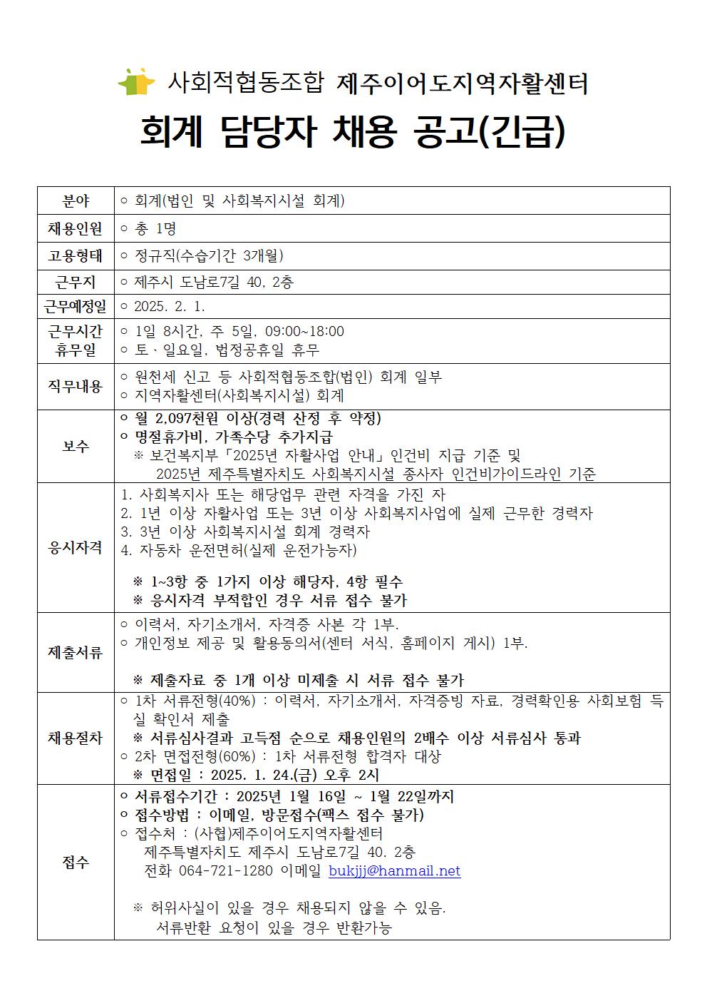 (긴급)사회적협동조합 제주이어도지역자활센터 정규직(회계) 채용 공고