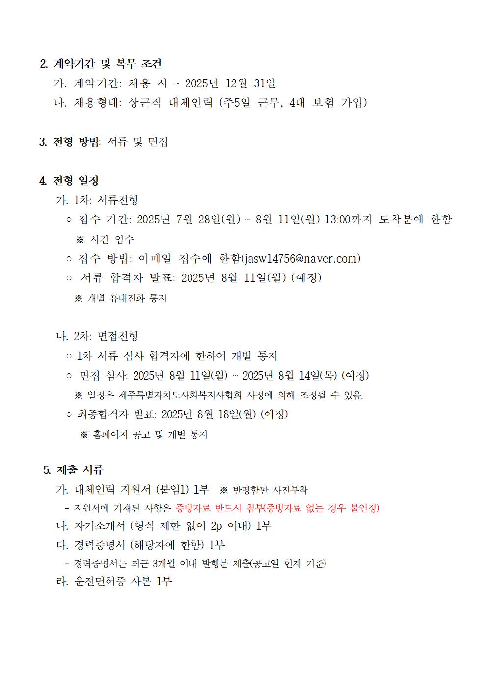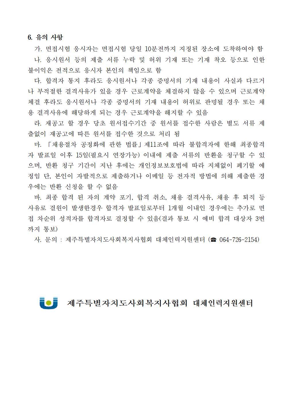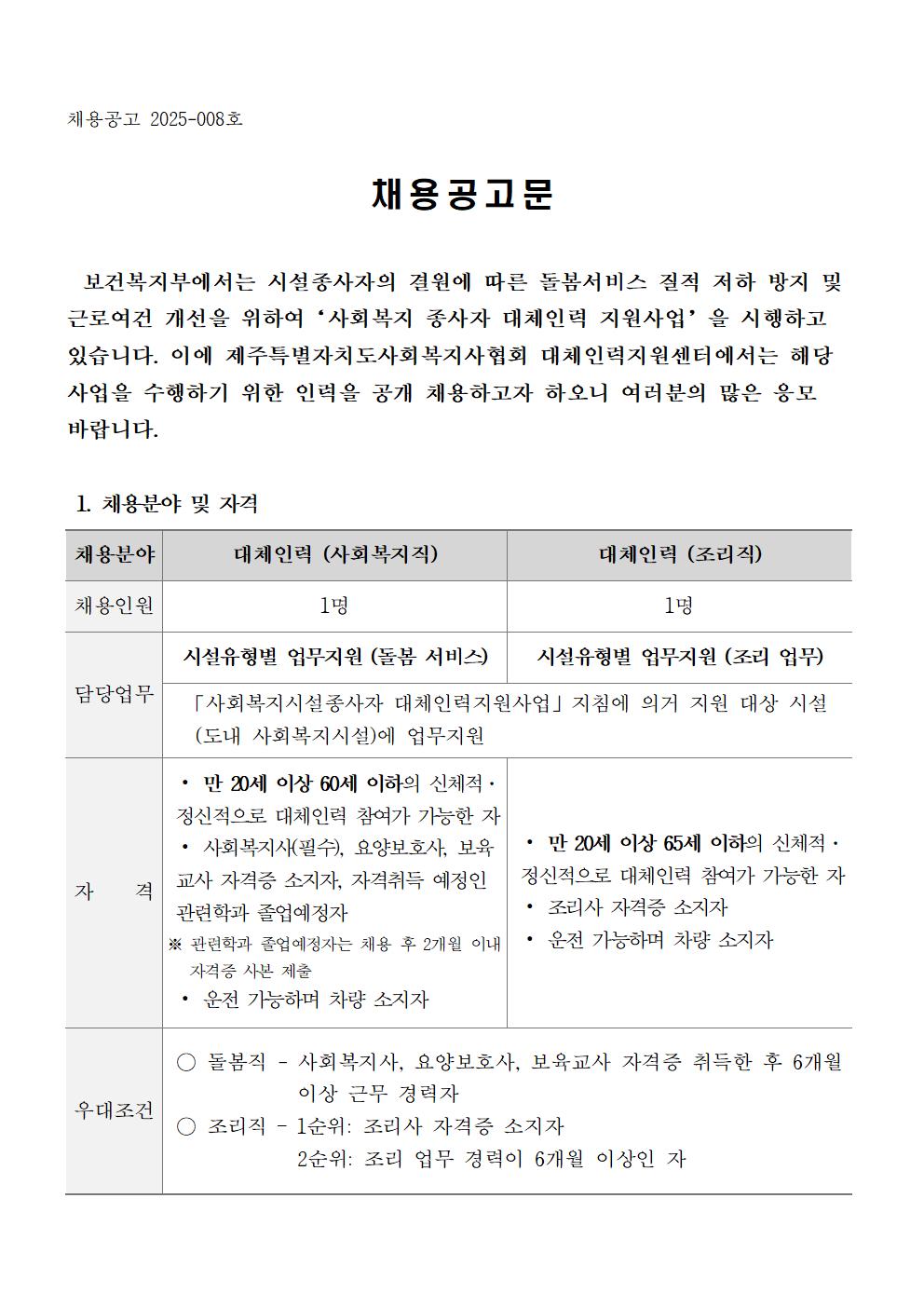 2025년 제6차 제주특별자치도사회복지사협회 대체인력지원센터 직원 채용 공고(돌봄직, 조리직)