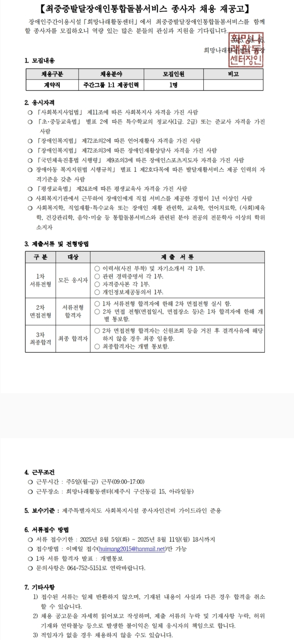 [희망나래활동센터]최중증발달장애인통합돌봄서비스 종사자 채용 재공고