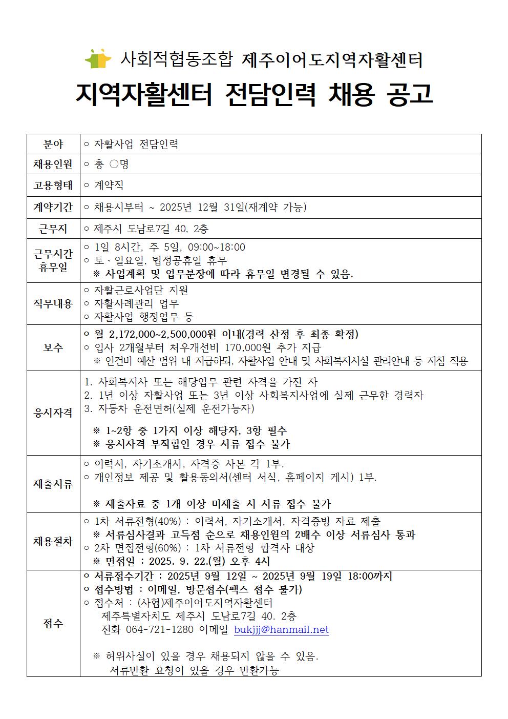사회적협동조합 제주이어도지역자활센터에서 자활사업 전담인력을 채용합니다.