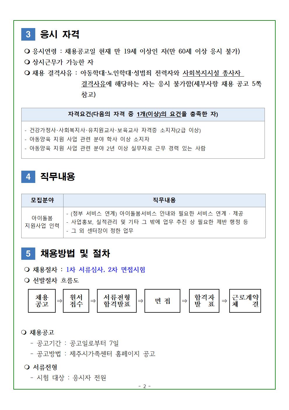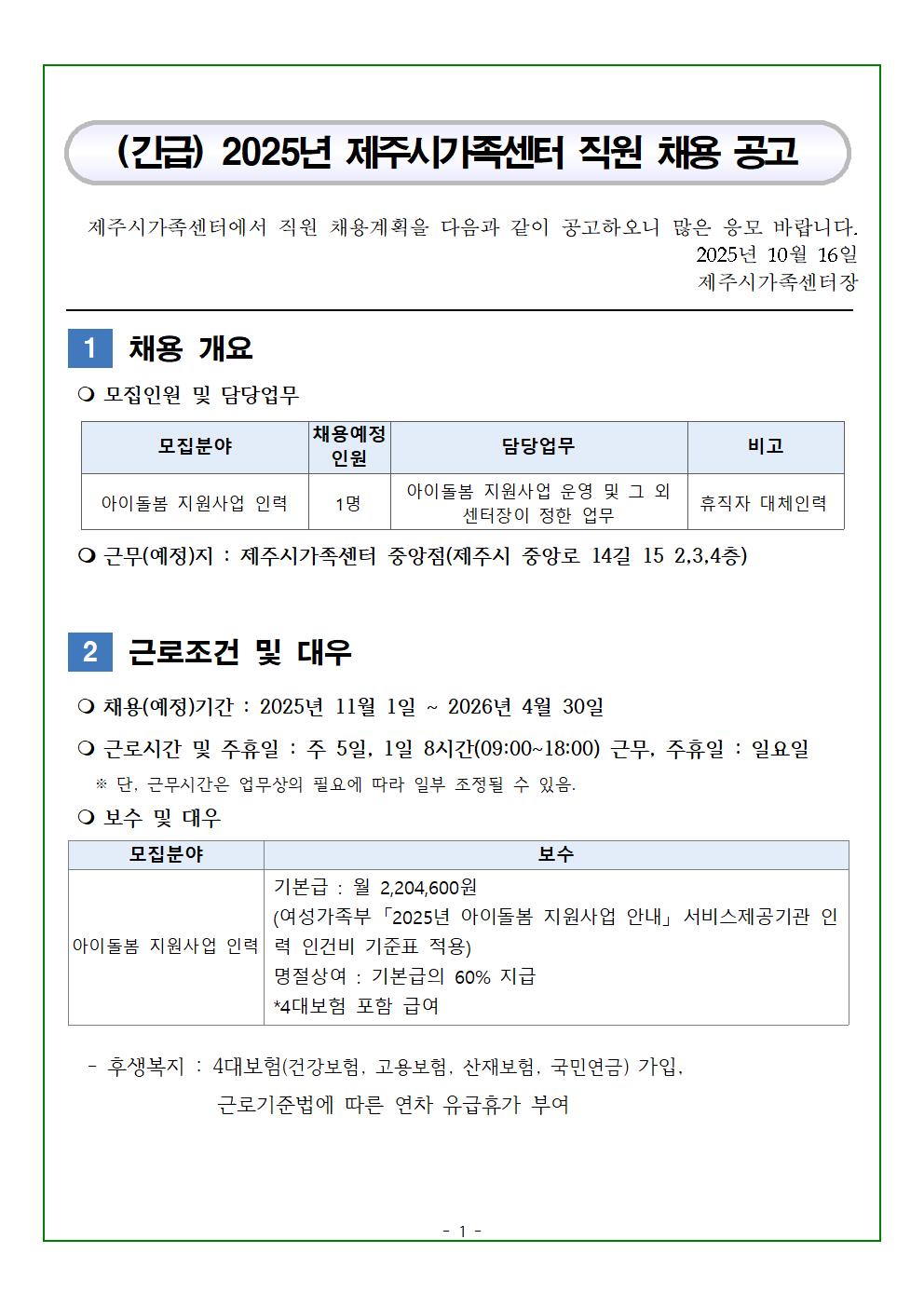 [긴급공고] 2025년 제주시가족센터 직원 채용 공고(아이돌봄 지원사업 인력 : 휴직자 대체)