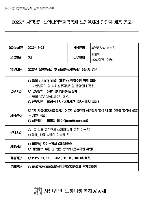 사단법인 느영나영복지공동체 2026년 노인일자리 담당자 채용 공고