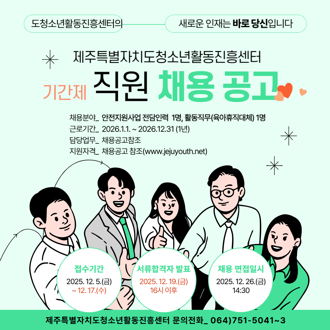 - 채용분야 및 인원: 기간제 2명(안전지원사업인력, 육아휴직대체)*채용기간: 2026.1.1.~2026.12.31.