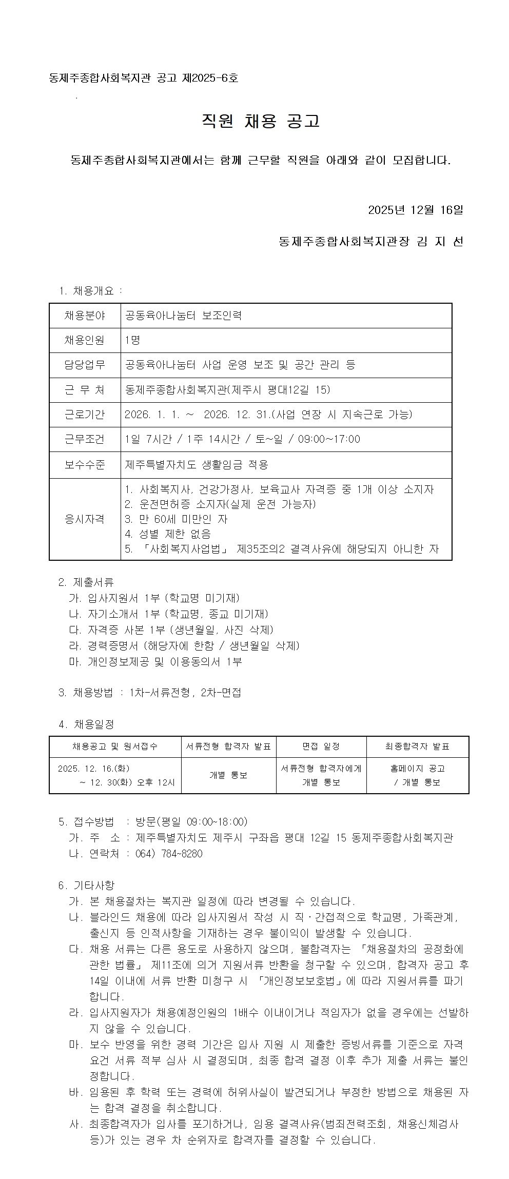 동제주종합사회복지관 공동육아나눔터 보조인력 채용 공고