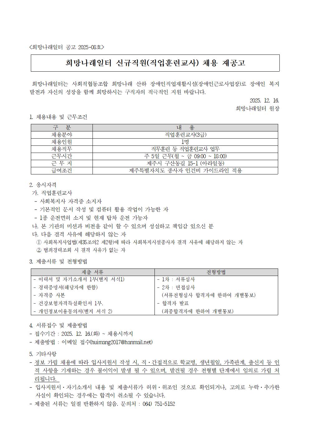 [희망나래일터] 신규직원(직업훈련교사) 채용 재공고